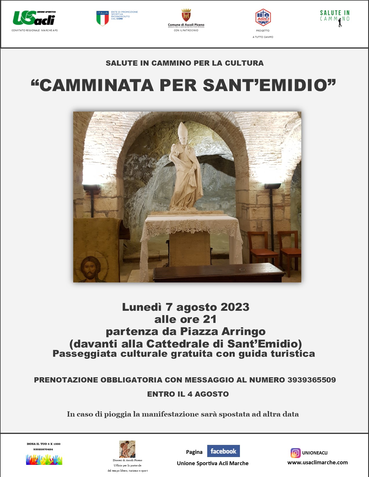L’appuntamento con “Salute in cammino per la cultura” è fissato ogni lunedì alle 21 con partenza da Piazza Arringo davanti alla cattedrale, la partecipazione è gratuita ma occorre prenotare inviando un messaggio al numero 3939365509, indicando il proprio nome e cognome e la data di svolgimento dell’iniziativa.