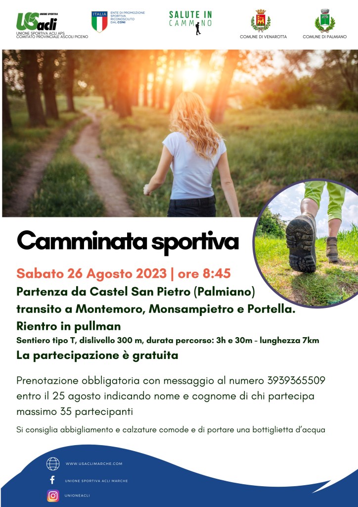 Sabato 26 agosto si svolgerà una camminata sportiva con partenza alle 8,45 da Castel San Pietro (frazione di Palmiano) che attraverserà anche Montemoro di Force, Monsampietro e Portella di Venarotta.