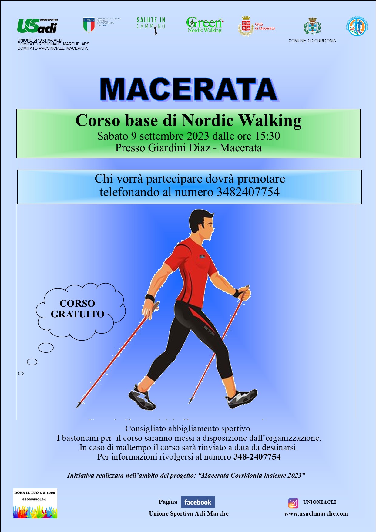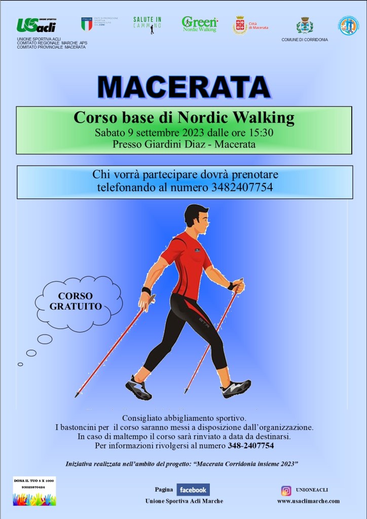 Si tratta di una iniziativa organizzata dall’U.S. Acli Marche Aps, dall’U.S. Acli provinciale di Macerata Aps, dalla Polisportiva Acli Macerata, dalla Scuola italiana di camminata sportiva, dall’Asd Green Nordic Walking, nell’ambito del progetto “Macerata Corridonia insieme 2023” realizzato dalle amministrazioni comunali di Macerata e Corridonia.