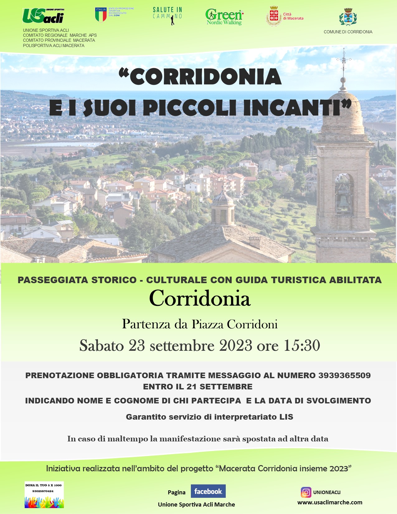 Il progetto “Macerata e Corridonia insieme 2023” è realizzato dai Comuni di Corridonia e Macerata, da ASD Green Nordic Walking, da A.S.D. La Torre Smeducci, dall’Unione Sportiva Acli Marche Aps, dalla Polisportiva Acli Macerata e dal comitato provinciale dell’U.S. Acli di Macerata.