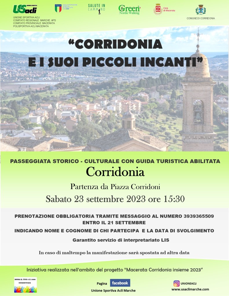 Si tratta di un progetto realizza dai Comuni di Corridonia e Macerata, da ASD Green Nordic Walking, da A.S.D. La Torre Smeducci, dall’Unione Sportiva Acli Marche Aps, dalla Polisportiva Acli Macerata e dal comitato provinciale dell’U.S. Acli di Macerata.