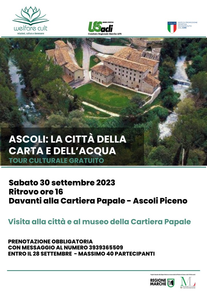 Nell’ambito del progetto “Welfare Cult: relazioni cultura e benessere” finanziato dalla Regione Marche con le risorse del Ministero del lavoro e delle politiche sociali, sabato 30 settembre alle 16 ad Ascoli Piceno è in programma l’iniziativa “Ascoli: la città della carta e dell’acqua”.