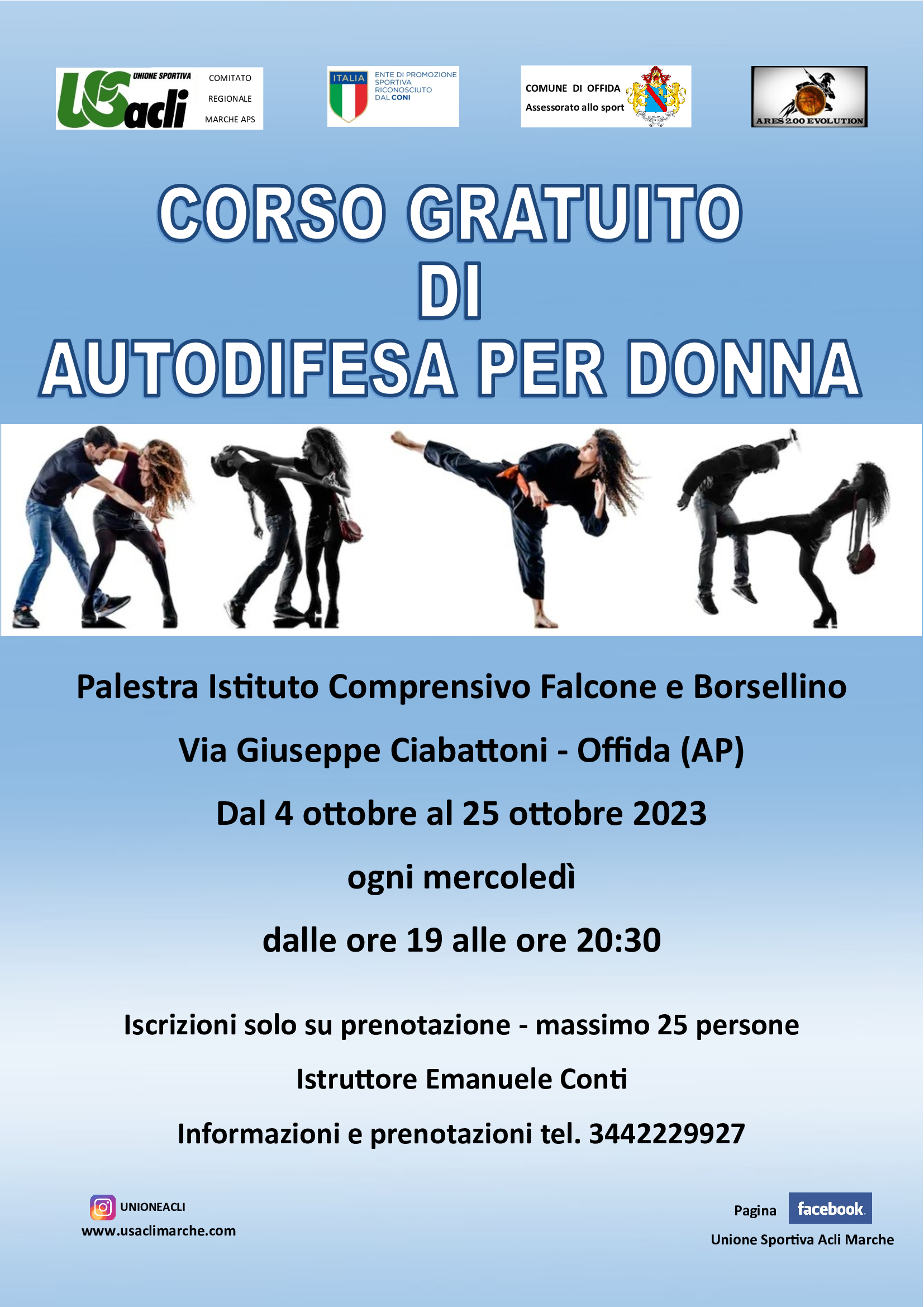 Sono aperte le iscrizioni al corso gratuito di autodifesa per donne che si svolgerà presso la palestra dell’Istituto Comprensivo Falcone e Borsellino in via Giuseppe Ciabattoni a Offida.