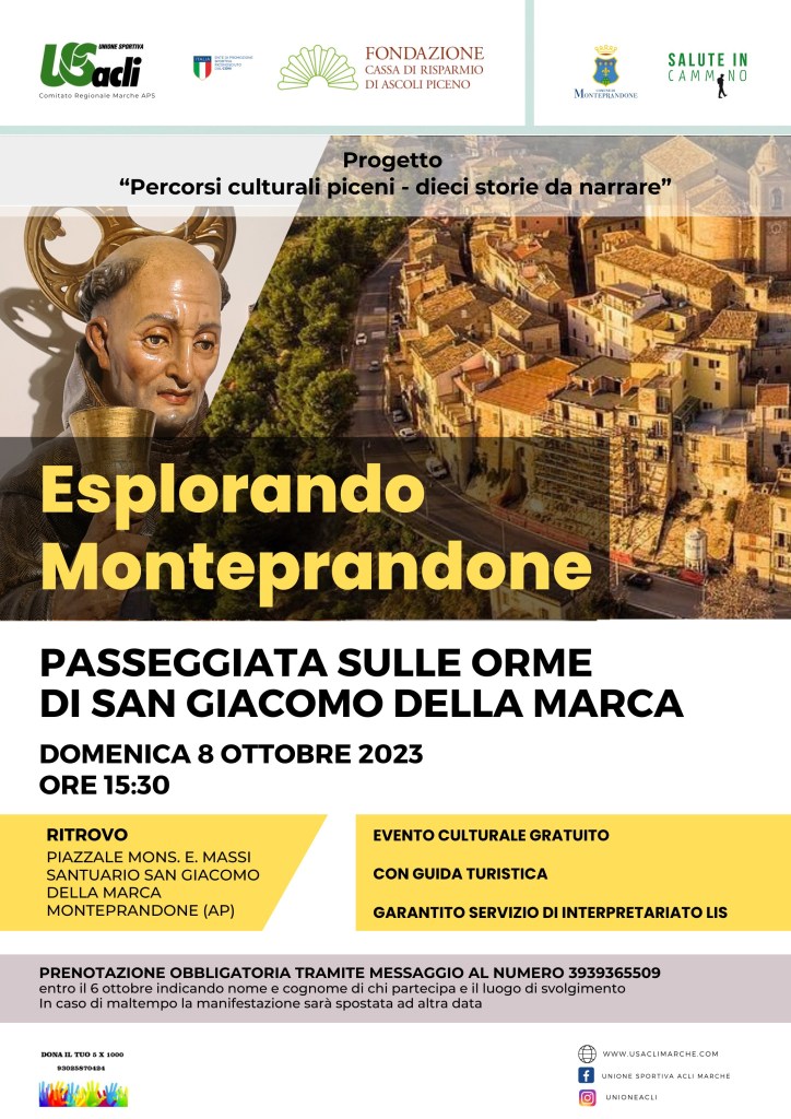Domenica 8 ottobre, con “Esplorando Monteprandone – Passeggiata sulle orme di San Giacomo della Marca”, si svolgerà, dopo quelli di Cossignano e Acquasanta Terme, il terzo appuntamento col progetto “Percorsi culturali piceni – dieci storie da narrare”.