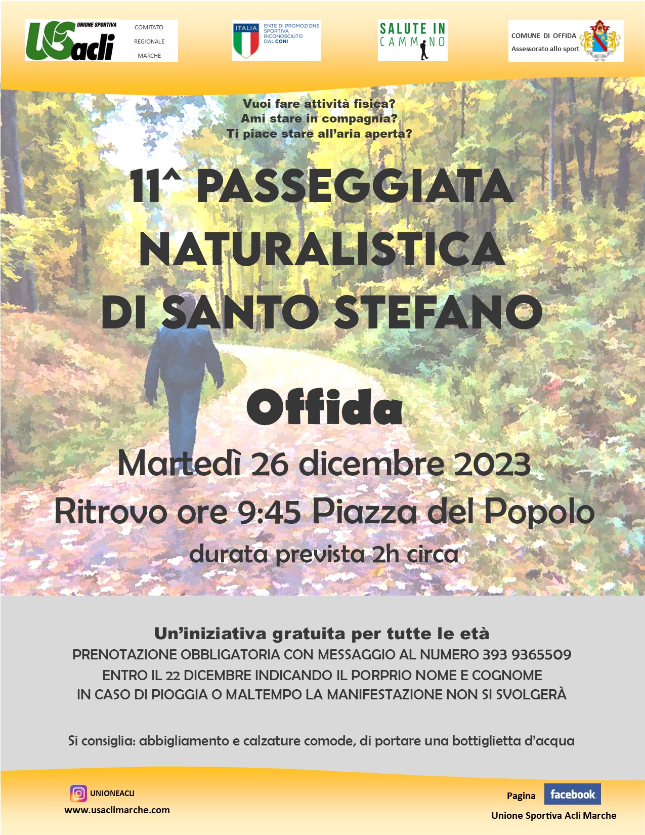 La partecipazione all’iniziativa, organizzata in collaborazione con U.S. Acli Marche APS e assessorato allo sport del Comune di Offida, è gratuita ma occorre preiscriversi entro il 22 dicembre con un messaggio al numero 3939365509, indicando la data della manifestazione e nome e cognome di chi partecipa.