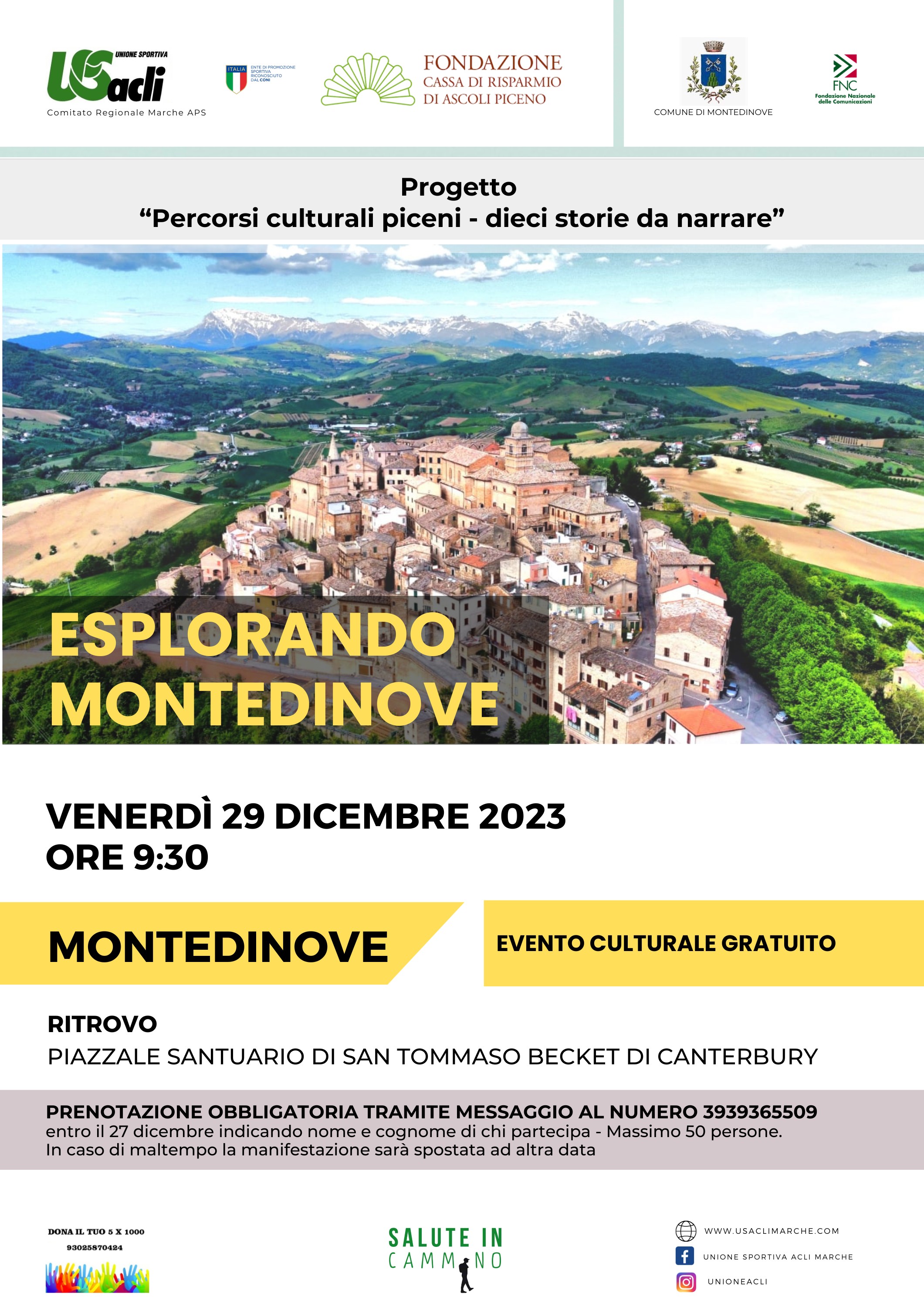 Il programma della manifestazione di venerdì 29 dicembre prevede il ritrovo dei partecipanti alle 9,30 nel piazzale del Santuario di San Tommaso Becket di Canterbury a Montedinove e a seguire l’attraversamento di un percorso culturale, con guida turistica abilitata, che permetterà di conoscere meglio la città e le sue ricchezze storiche, culturali ed artistiche.