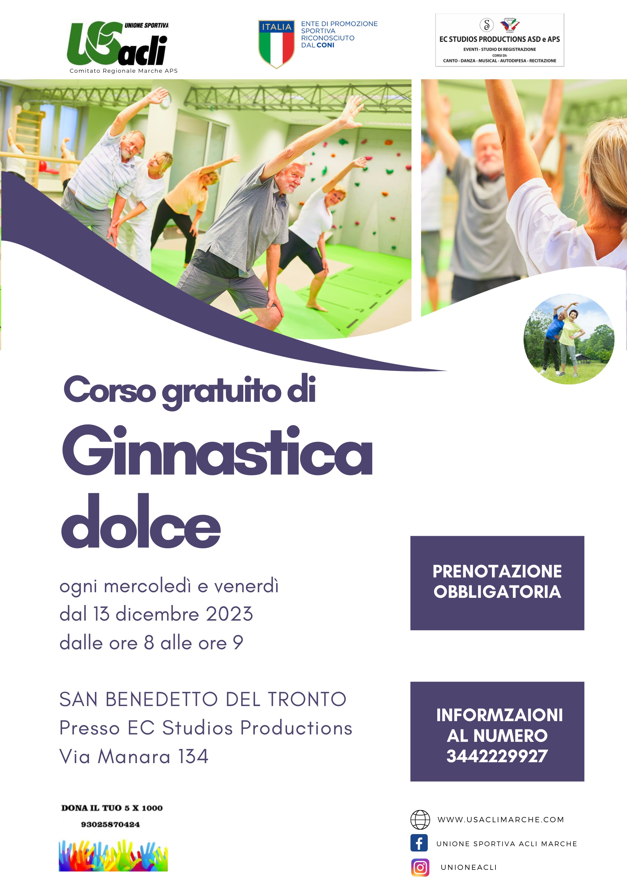 Dopo la breve pausa di fine 2023 ed inizio 2024 sono riprese le lezioni del corso gratuito di ginnastica dolce che si svolgono a San Benedetto del Tronto presso la sede di Ec Studios Production in via Manara134.