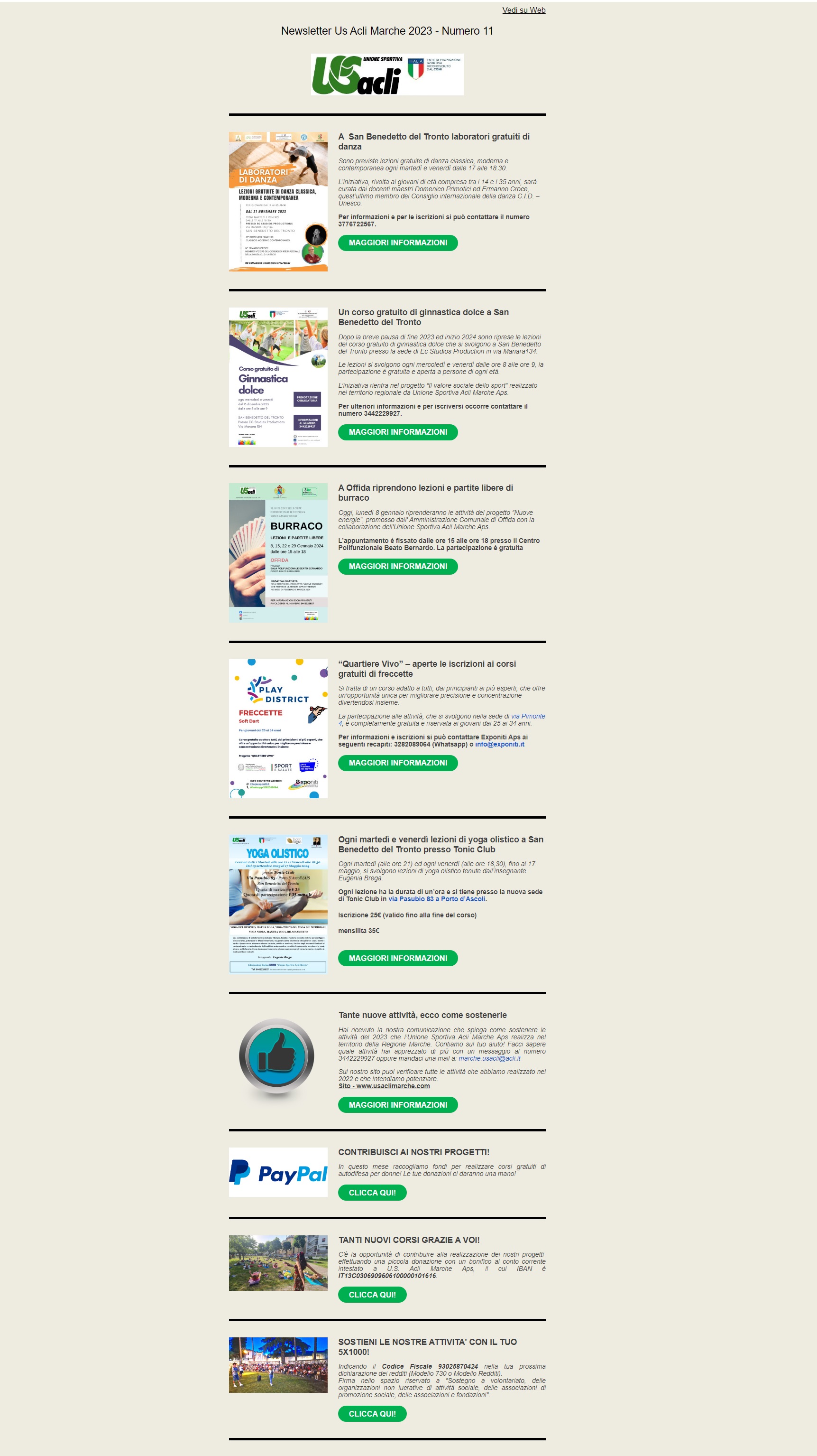 gennaio 8, 2024 Unione Sportiva Acli Marche Newsletter n. 1 dell’8 Gennaio 2024 Condividi: Fai clic per condividere su X (Si apre in una nuova finestra) X Fai clic per condividere su Facebook (Si apre in una nuova finestra) Facebook Mi piace Caricamento... Correlati