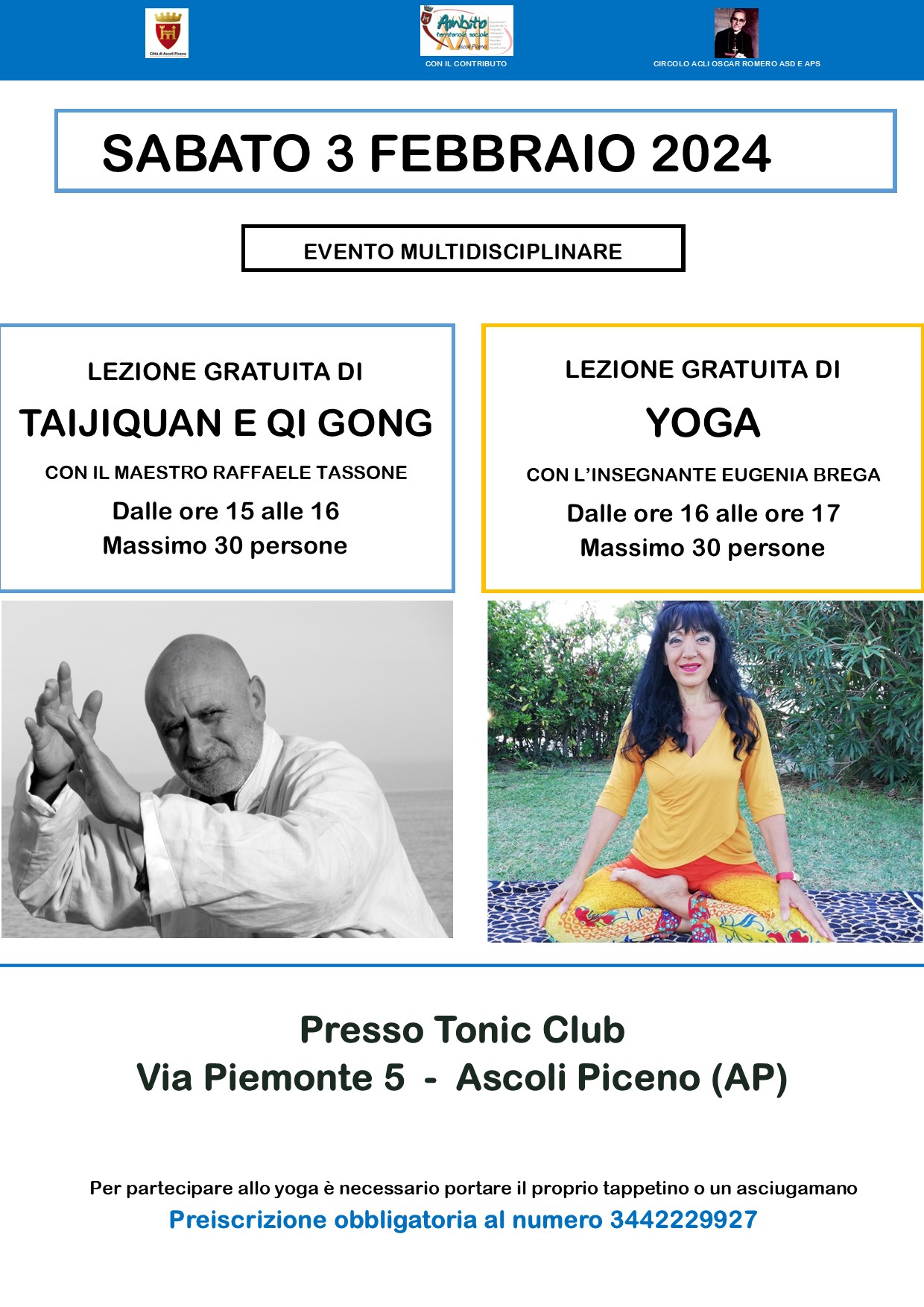 Ci sarà infatti l’opportunità di pratica gratuitamente il taijiquan/qigong (dalle 15 alle 16 con il maestro Raffaele Tassone) e lo yoga (dalle 16 alle 17 con l’insegnante Eugenia Brega) presso la palestra Tonic Club in via Piemonte 5 ad Ascoli Piceno.