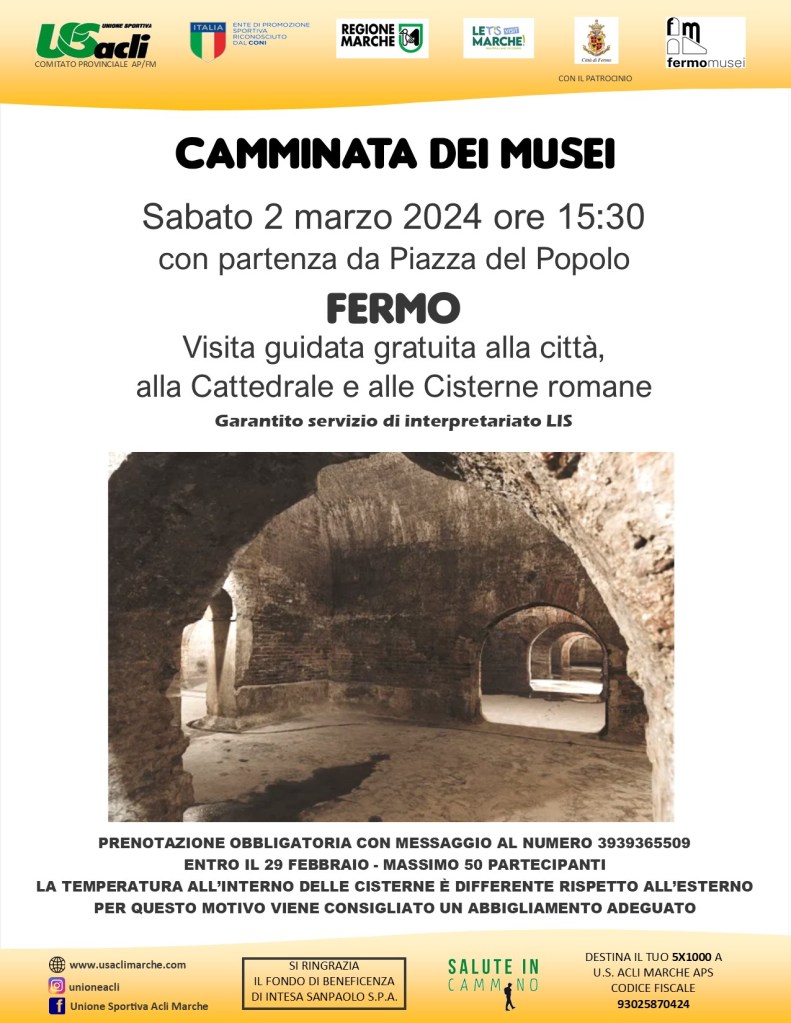 Sabato 2 marzo, dalle 15,30 alle 17,30 circa, a Fermo, si svolgerà un nuovo appuntamento del progetto “Camminata dei musei”. Si tratta di una iniziativa organizzata da U.S. Acli provinciale Ascoli Piceno/Fermo, con il contributo della Regione Marche, il sostegno del Fondo di beneficenza di Intesa Sanpaolo, il patrocinio del Comune di Fermo e la collaborazione di Fermo Musei.