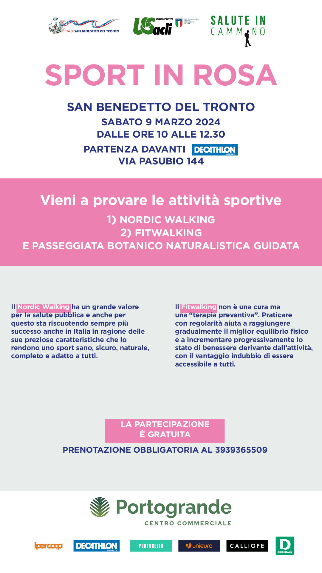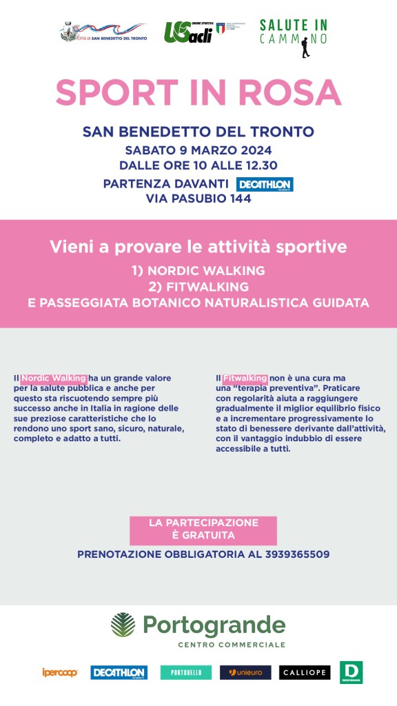 Sabato 9 marzo, infatti, dalle ore 10 alle 12,30 si svolgerà l’iniziativa “Sport in rosa” realizzata in collaborazione con il Comune di San Benedetto del Tronto (all’interno del programma di “Marzo è donna 2024”) e con il Centro commerciale Portogrande.