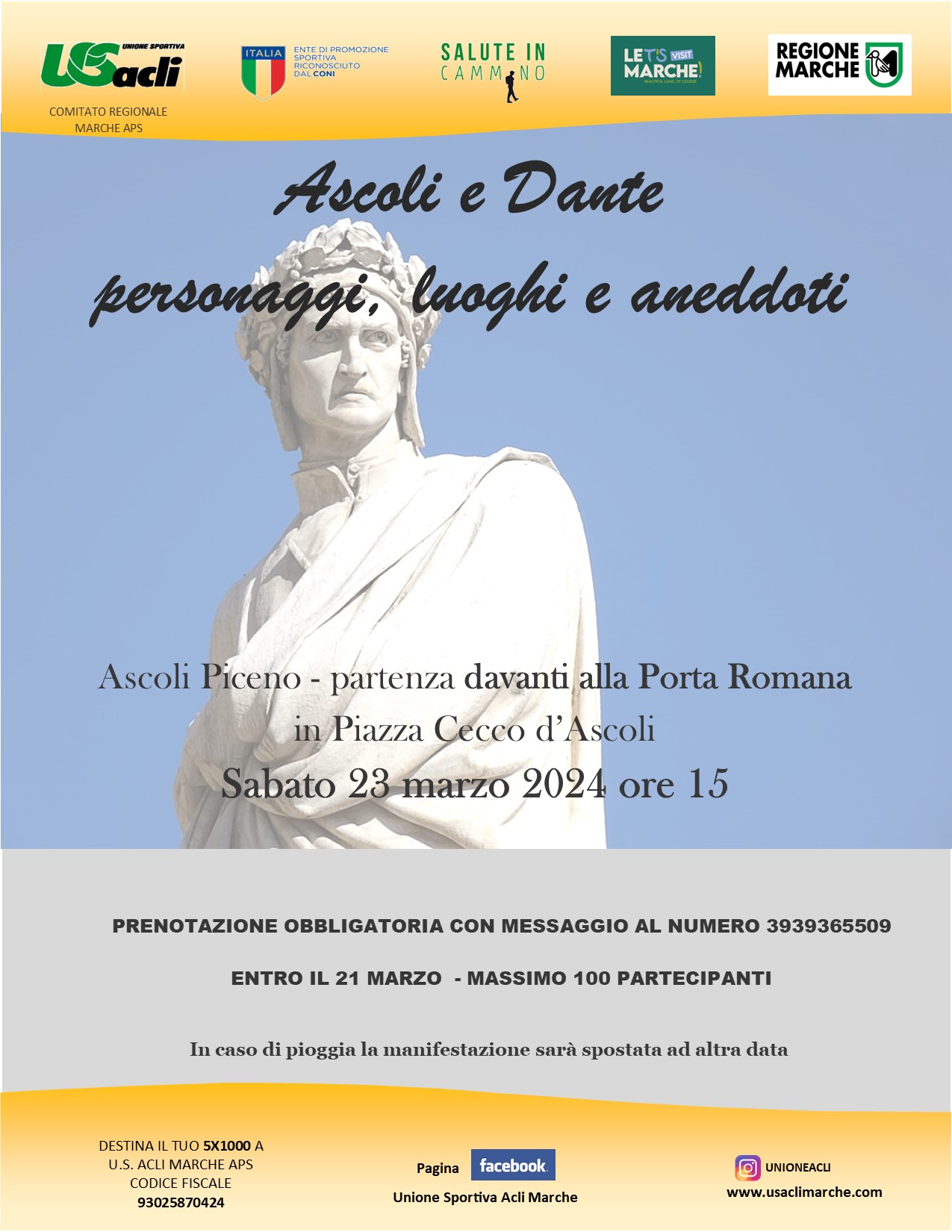 Già negli anni passati U.S. Acli Marche ha proposto l’iniziativa “Ascoli e Dante – personaggi, luoghi e aneddoti” che ha attirato l’attenzione di tanti appassionati alla figura del sommo poeta.