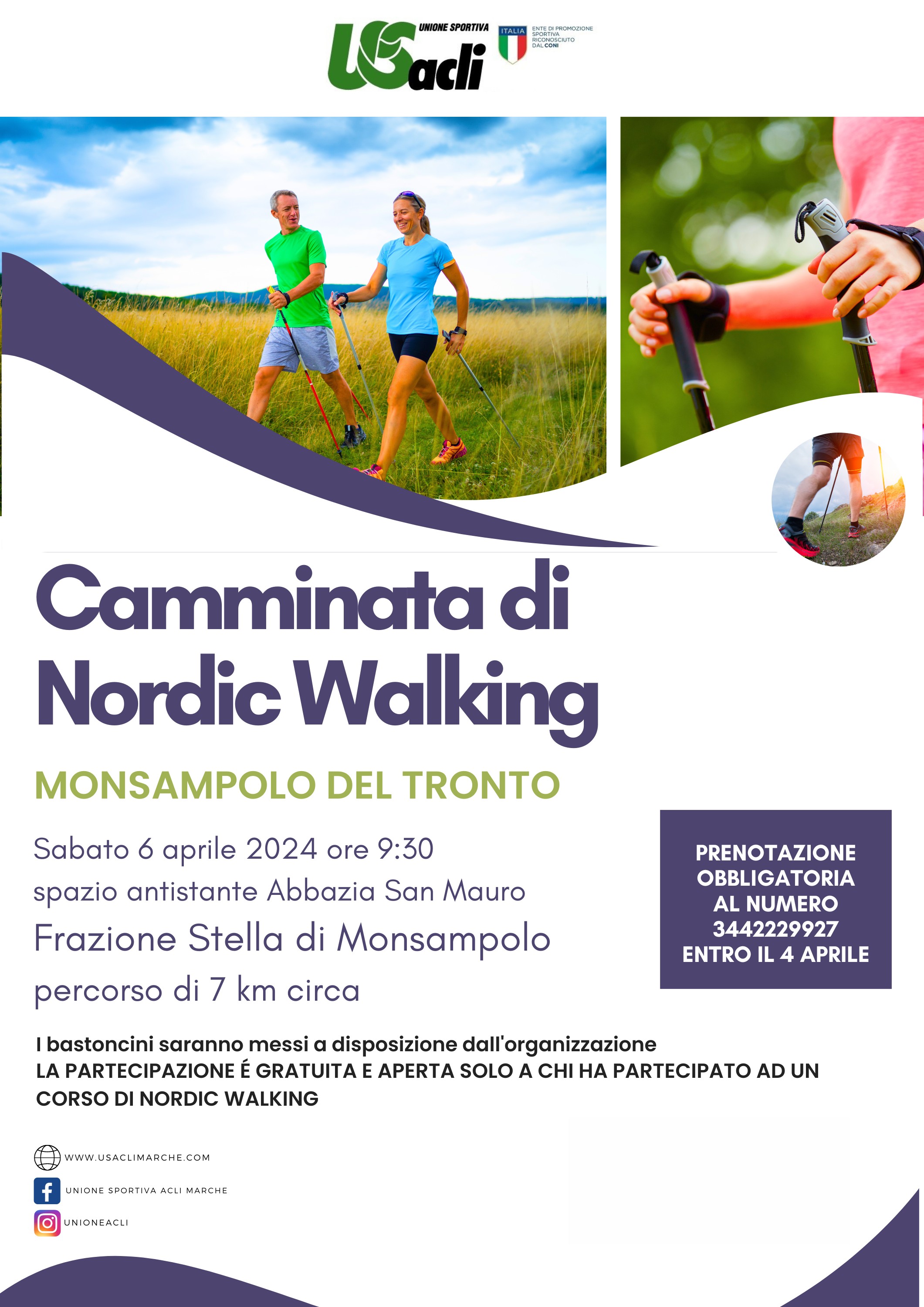 Sabato 6 aprile, a partire dalle ore 9,30, è in programma un nuovo appuntamento con il Nordic Walking a cura di Unione Sportiva Acli Marche Aps. L’appuntamento è fissato nello spazio antistante l’Abbazia di San Mauro a Stella di Monsampolo. La partecipazione all’iniziativa è riservata a chi ha già seguito un corso base di Nordic Walking, è gratuita, prevede l’attraversamento di un percorso di circa 7 chilometri e necessita di iscrizione inviando un messaggio al numero 3442229927 I bastoncini per poter partecipare alla camminata saranno messi a disposizione dall’organizzazione.