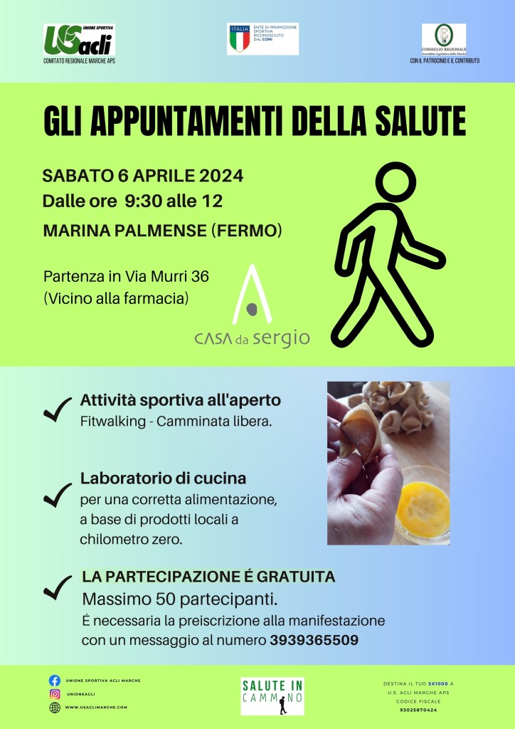 A Marina Palmense (Fermo), dalle 9,30 alle 12 di sabato 6 aprile, infatti, si svolgerà “Gli appuntamenti della salute” con partenza da Casa Da Sergio, in via Murri 36 (vicino alla farmacia).