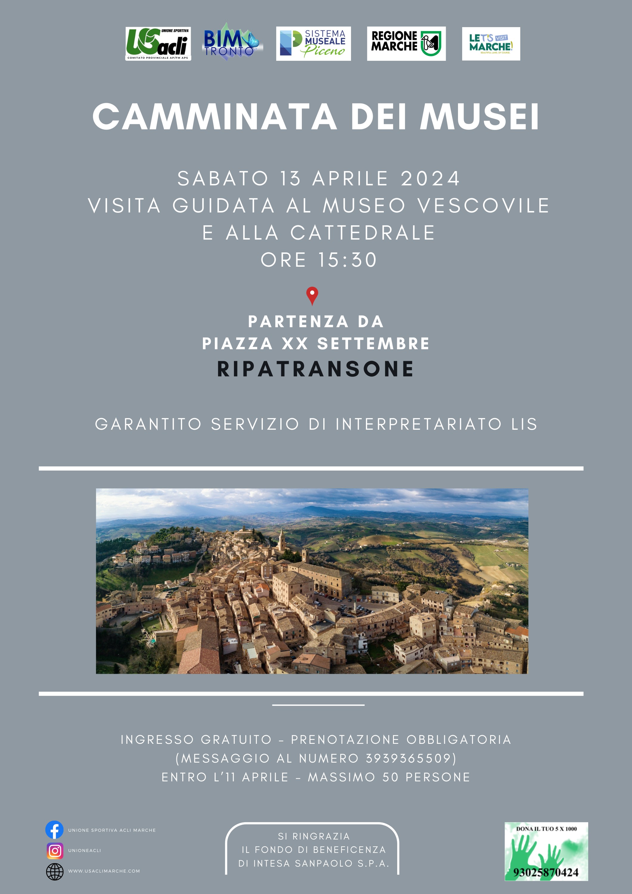 Sabato 13 aprile si svolgerà, grazie alla collaborazione tra Bim Tronto e U.S. Acli provinciale, un nuovo appuntamento dell’iniziativa “Camminata dei musei” che farà tappa a Ripatransone.