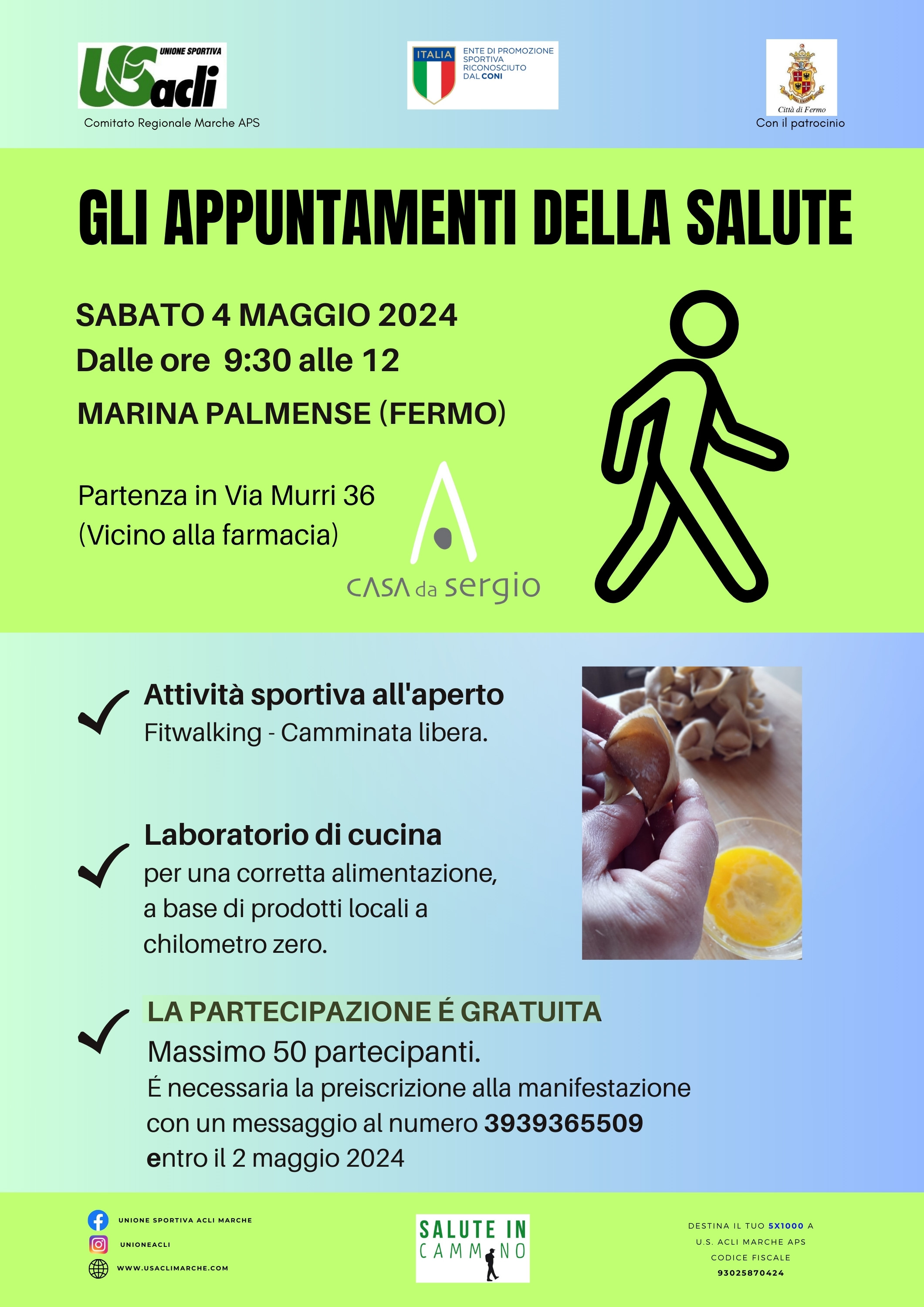 A Marina Palmense (Fermo), dalle 9,30 alle 12 di sabato 4 maggio, infatti, si svolgerà “Gli appuntamenti della salute” con partenza da Casa Da Sergio, in via Murri 36 (vicino alla farmacia).