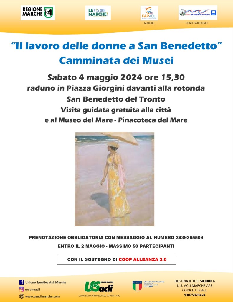 L’iniziativa di sabato 4 maggio rientra nel progetto “Camminata dei musei”, è la dodicesima del 2024, ed è organizzata col sostegno di Regione Marche, Fap Acli Marche, Coop Alleanza 3.0 e col patrocinio del Comune di San Benedetto del Tronto.