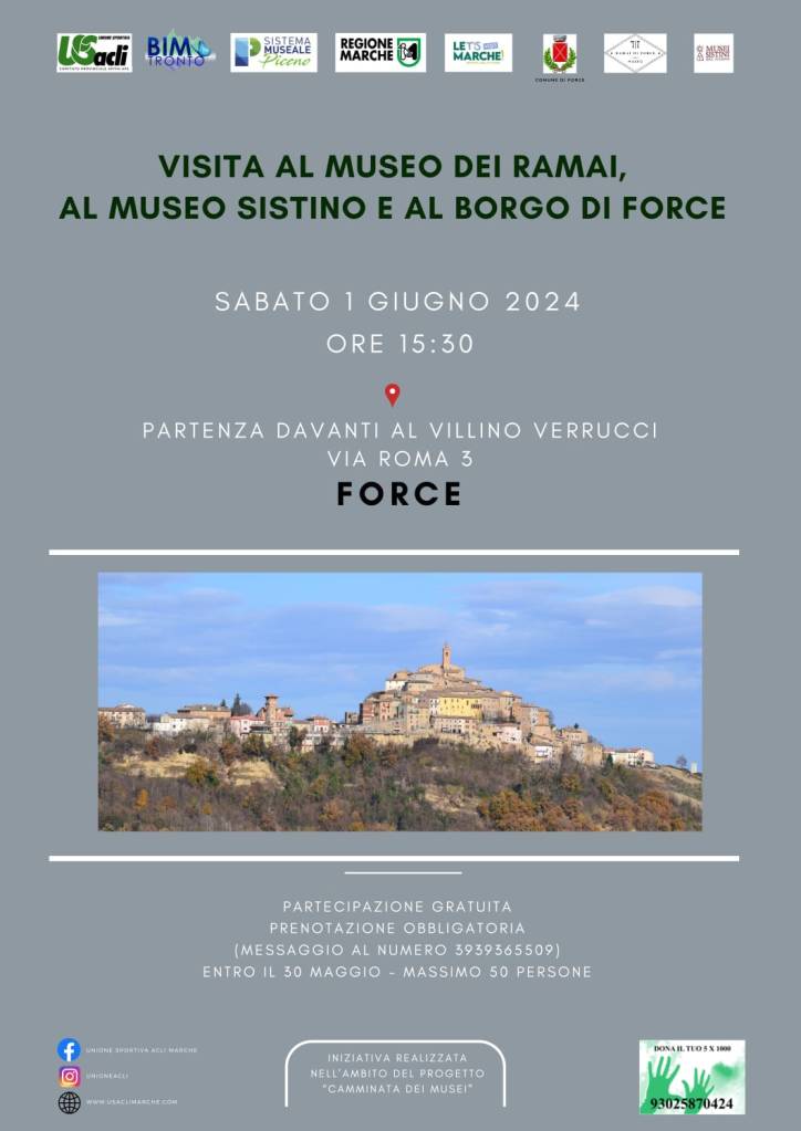 Sabato 1 giugno si svolgerà, grazie alla collaborazione tra Bim Tronto e U.S. Acli provinciale Aps, un nuovo appuntamento dell’iniziativa “Camminata dei musei” che farà tappa a Force