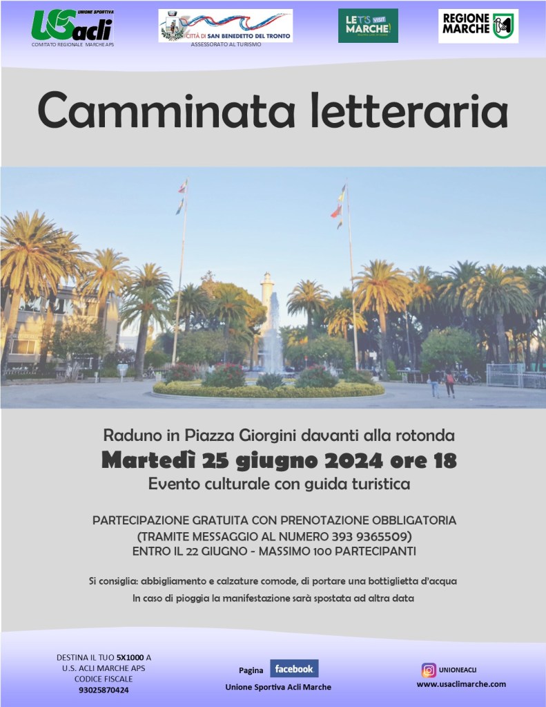 SAN BENEDETTO DEL TRONTO – Martedì 25 giugno prenderà il via l’iniziativa “Salute in cammino per la cultura” realizzata da U.S. Acli Marche Aps, Assessorato al turismo del Comune di San Benedetto del Tronto e Regione Marche.