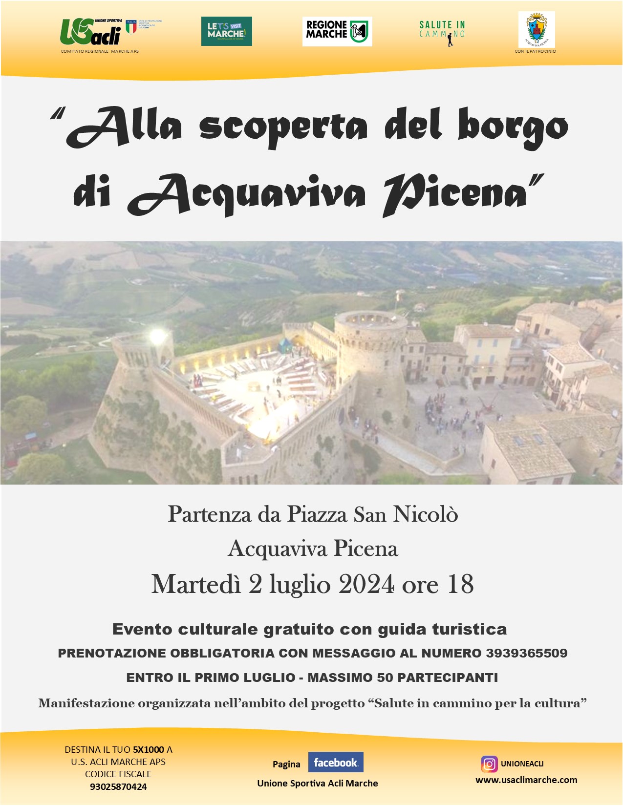 Martedì 2 luglio, ad Acquaviva Picena, è in programma “Salute in cammino per la cultura”, con un itinerario culturale dedicato alla scoperta di uno degli splendidi borghi del Piceno.