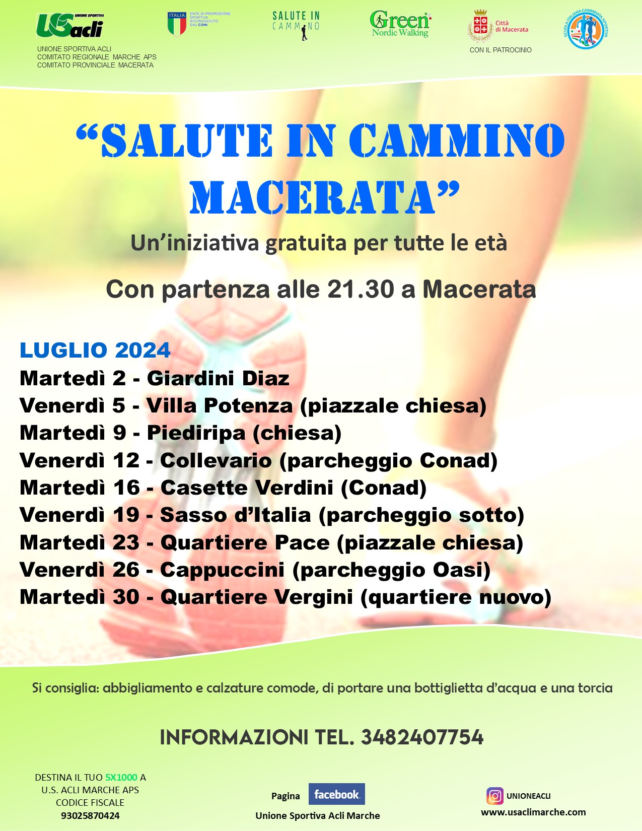 L’iniziativa è organizzata dall’U.S. Acli Marche Aps, dall’U.S. Acli provinciale di Macerata Aps, dalla Scuola italiana di camminata sportiva, dall’Asd Green Nordic Walking, col patrocinio del Comune di Macerata.