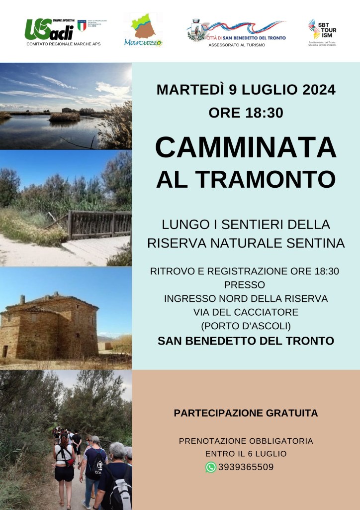 SAN BENEDETTO DEL TRONTO – Dopo il successo di partecipanti fatto registrare dalle precedenti edizioni della manifestazione, torna la “Camminata al tramonto alla Sentina”, iniziativa che si svolgerà martedì 9 luglio.