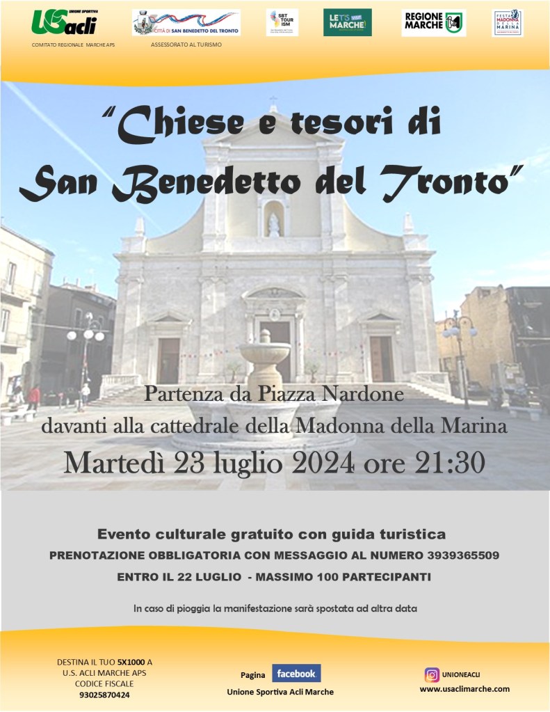 SAN BENEDETTO DEL TRONTO – Nell’ambito del progetto “Salute in cammino per la cultura” realizzato da U.S. Acli Marche Aps, Assessorato al turismo del Comune di San Benedetto del Tronto e Regione Marche, martedì 23 luglio si svolgerà un evento culturale.