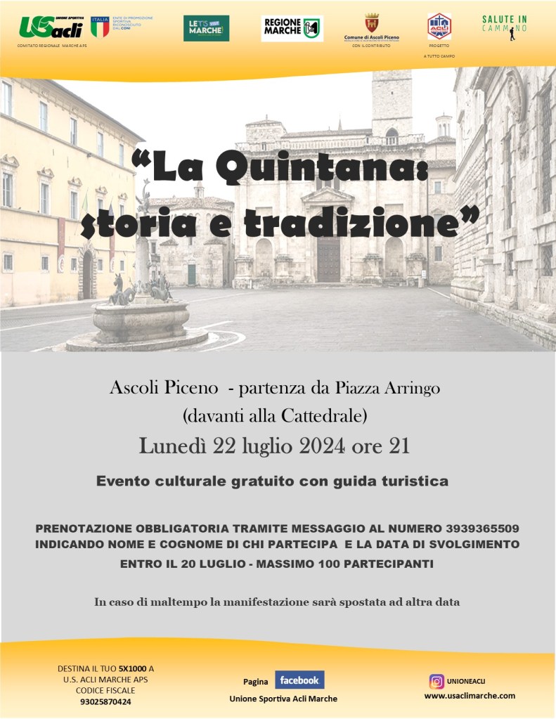 ASCOLI – “La Quintana: storia e tradizione”. E’ questo il titolo del quinto appuntamento con l’iniziativa “Salute in cammino per la cultura” che si svolgerà lunedì 22 luglio alle 21 con partenza da Piazza Arringo.