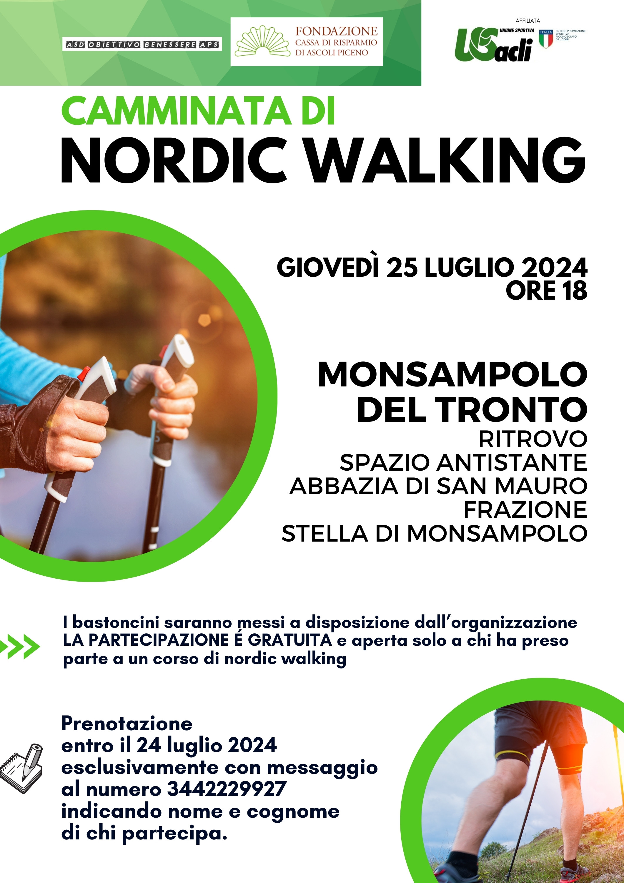 MONSAMPOLO DEL TRONTO – Grazie alla collaborazione di ASD APS Obiettivo Benessere e Fondazione Carisap, che sostiene il progetto con un contributo, è in programma giovedì 25 luglio una camminata di Nordic Walking.