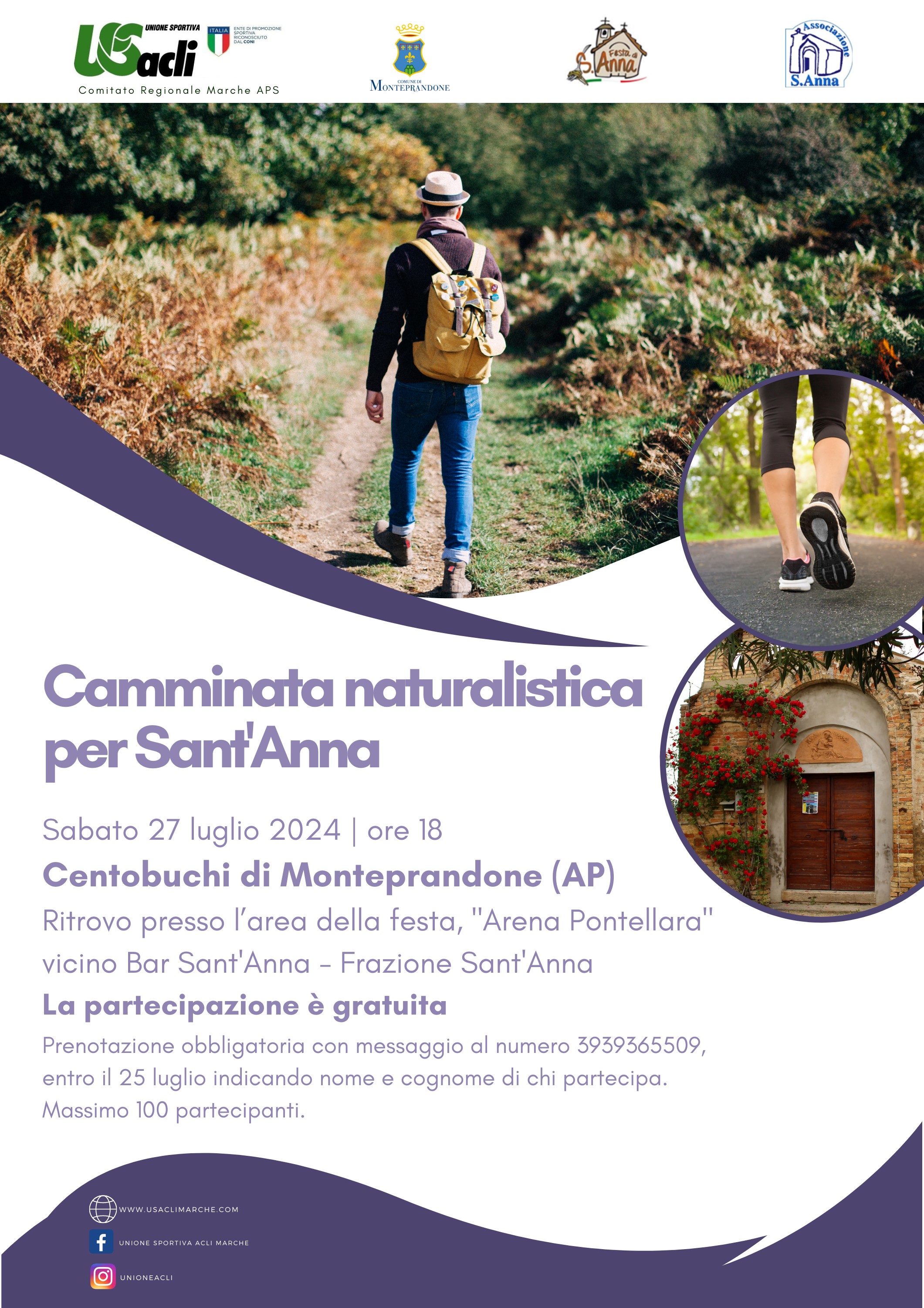 MONTEPRANDONE – Sabato 27 Luglio si rinnova l’appuntamento con la “Camminata per Sant’Anna” che prenderà il via alle 18 presso l’area della festa “Arena Pontellara”, vicino al Bar Sant’Anna di Centobuchi.