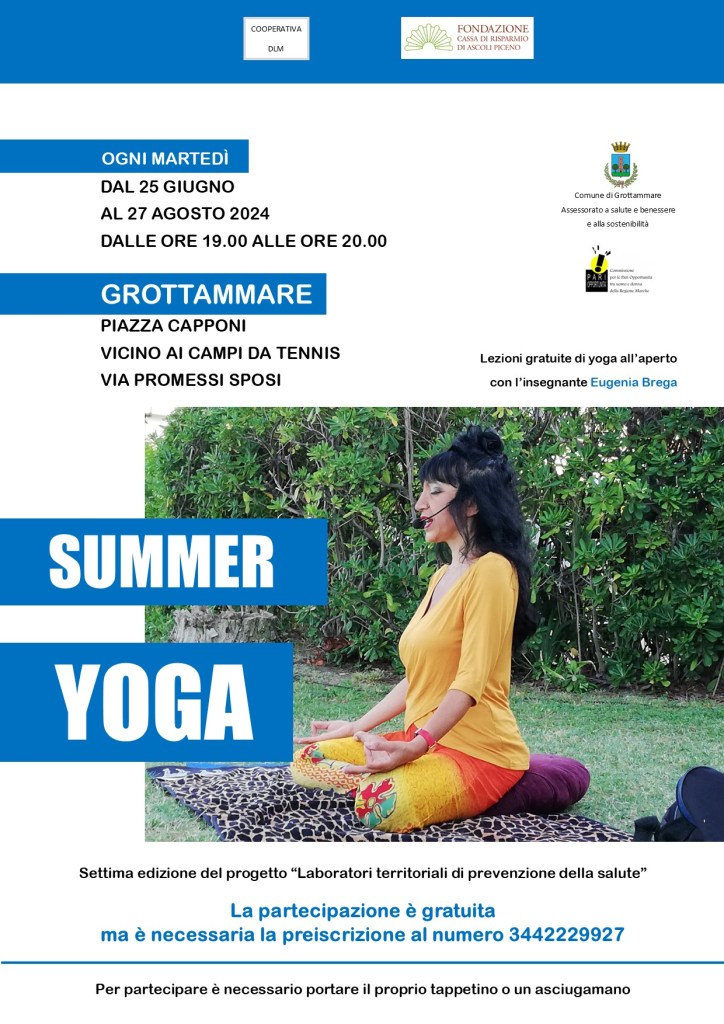 E’ entrata nel vivo anche la settima edizione del progetto “Summer Yoga – Laboratori territoriali di prevenzione della salute”. Si tratta di lezioni gratuite di yoga, tenute dall’insegnante Eugenia Brega, che si svolgono ogni martedì fino al 27 agosto presso Piazza Capponi, vicino ai campi da tennis Via Promessi Sposi a Grottammare. L’iniziativa è realizzata dalla Cooperativa DLM, col patrocinio e il contributo del Comune di Grottammare, assessorato a salute e benessere e sostenibilità e della Commissione per le pari opportunità tra uomo e donna della Regione Marche, col sostegno della Fondazione Carisap. La partecipazione al progetto è gratuita, occorre però preiscriversi contattando il numero 3442229927 (anche tramite messaggio). Per seguire le lezioni occorre portare il proprio tappetino o un asciugamano. Al progetto stanno partecipando 145 persone di ogni età.