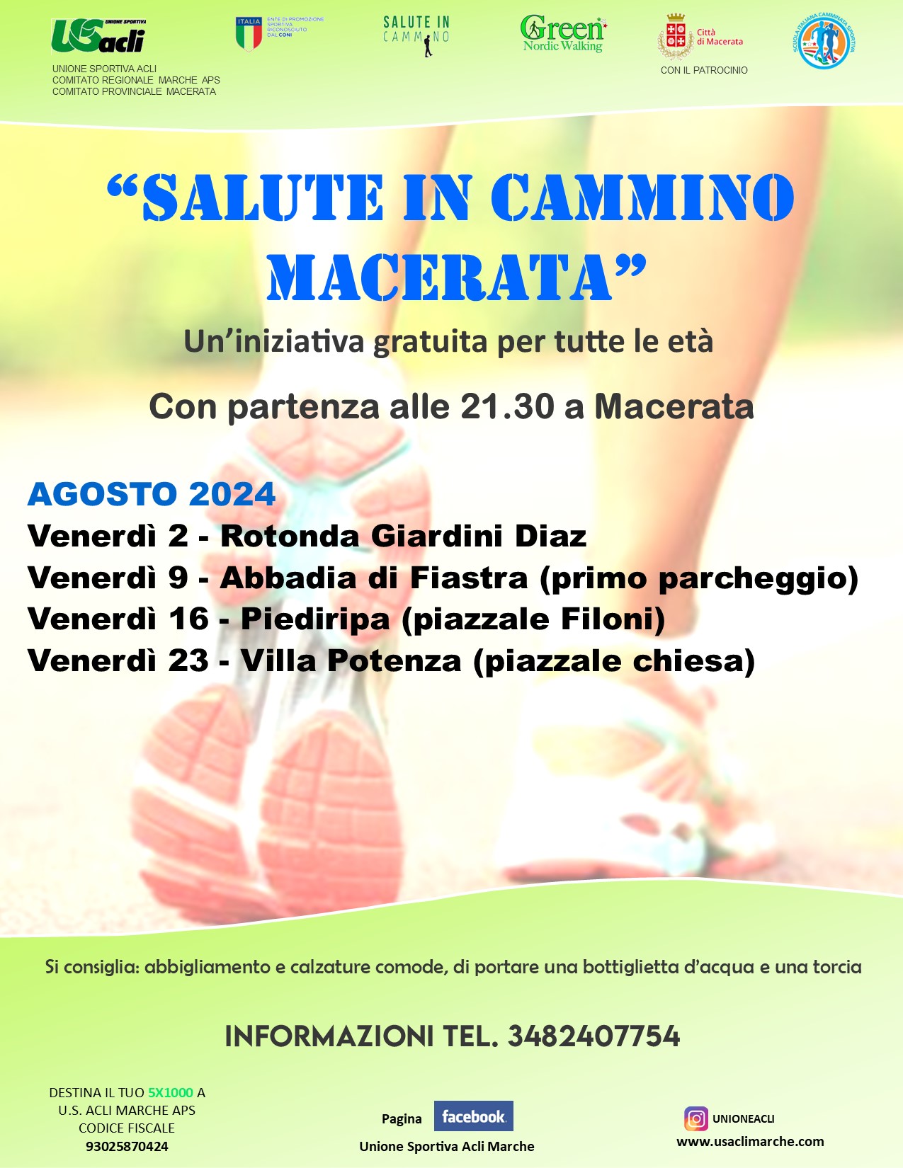 L’iniziativa è organizzata dall’U.S. Acli Marche Aps, dall’U.S. Acli provinciale di Macerata Aps, dalla Scuola italiana di camminata sportiva, dall’Asd Green Nordic Walking, col patrocinio del Comune di Macerata.