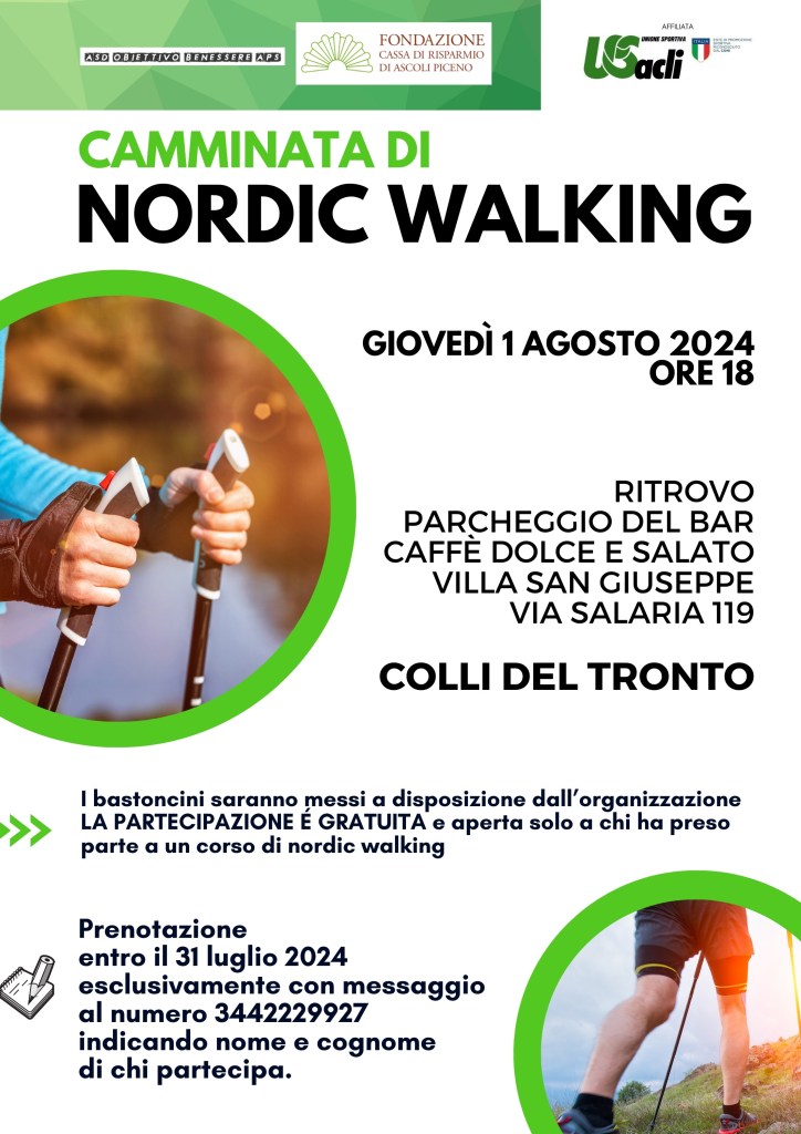 COLLI DEL TRONTO – Grazie alla collaborazione di ASD APS Obiettivo Benessere e Fondazione Carisap, che sostiene il progetto con un contributo, è in programma giovedì 1 agosto una camminata di Nordic Walking.