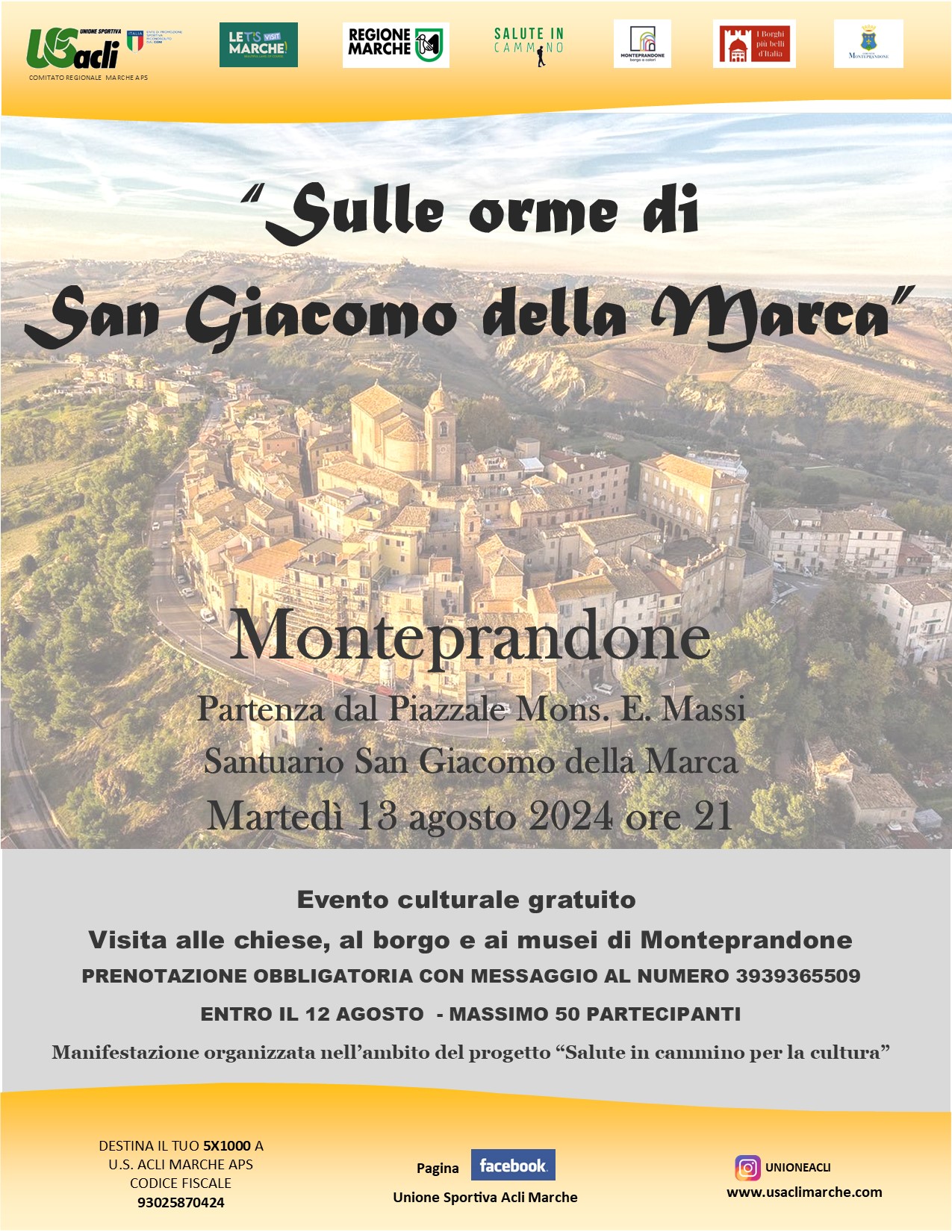 La manifestazione dell’Unione Sportiva Acli Marche Aps, dopo i positivi riscontri delle precedenti edizioni e dei primi due appuntamenti del 2024, viene riproposta e organizzata col sostegno dell’Amministrazione comunale di Monteprandone e della Regione Marche. Il programma dell’evento prevede il raduno dei partecipanti nel piazzale Mons. E. Massi davanti al Santuario di San Giacomo della Marca alle 21. A seguire è prevista la visita alle ricchezze storiche, culturali e architettoniche di Monteprandone, compreso lo splendido borgo, i musei e la casa natale del patrono San Giacomo della Marca. Per partecipare occorre prenotare entro il 12 agosto con un messaggio al numero 3939365509 indicando il proprio nome e cognome e la data della manifestazione. E’ previsto un numero massimo di 50 partecipanti.