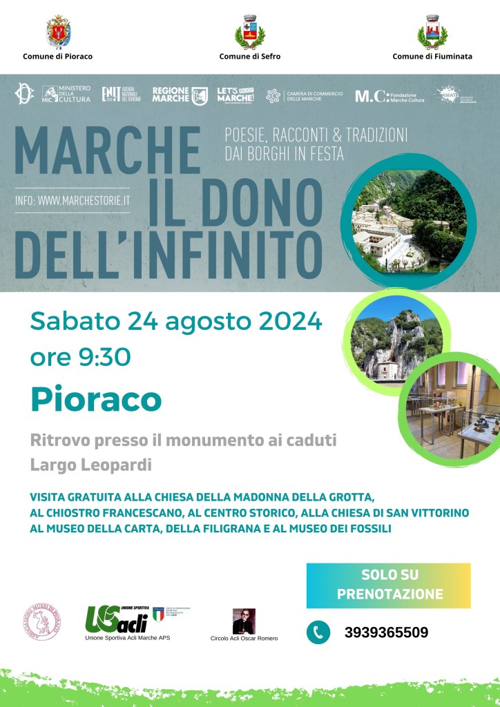 Per partecipare alla visita guidata gratuita di Pioraco occorre inviare un messaggio al numero 3939365509 indicando nome e cognome di chi sarà presente entro il 22 agosto. La partecipazione alla manifestazione, organizzata in collaborazione con U.S. Acli Marche, Circolo Acli Oscar Romero e Associazione Musei di Pioraco, è gratuita.