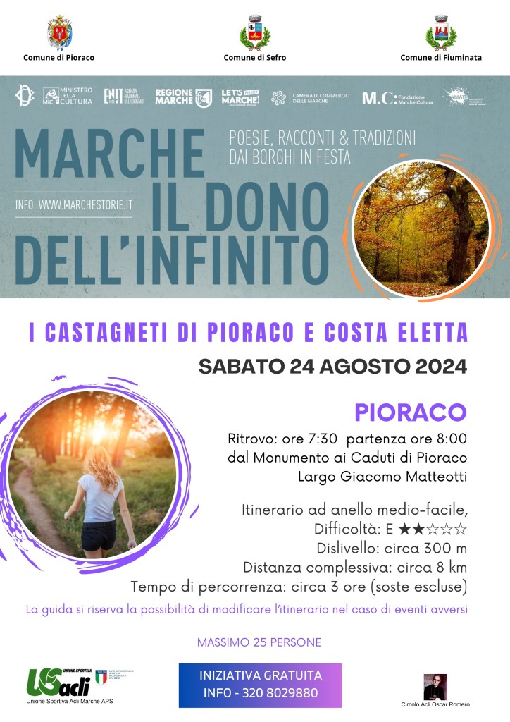 L’appuntamento è fissato per le ore 7,30 presso il monumento ai caduti in Largo Matteotti a Pioraco, dove alle 8 prenderà il via un itinerario ad anello medio/facile. L’iniziativa rientra nel progetto “I percorsi della poesia e dell’infinito marchigiano”, realizzata dai comuni di Pioraco, Sefro e Fiuminata nell’ambito della quarta edizione di MArCHESTORIE.