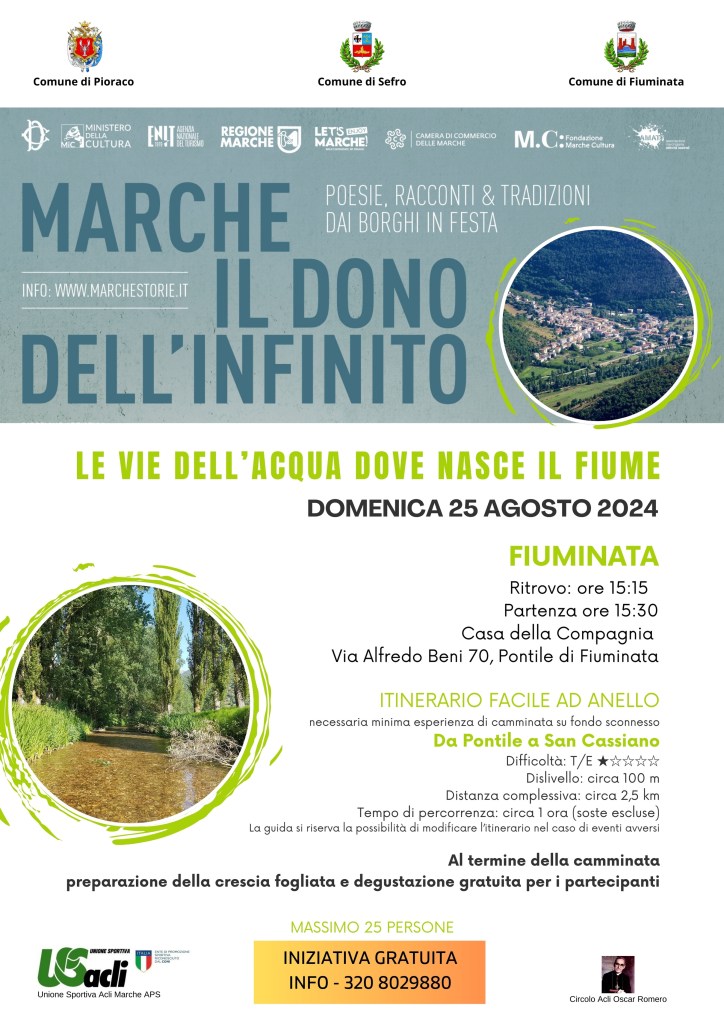 In occasione di MarcheStorie, progetto di Regione Marche/Assessorato alla cultura, in collaborazione con AMAT e Fondazione Marche Cultura, domenica 25 agosto si svolgerà l’iniziativa “Le vie dell’acqua – dove nasce il fiume” a Pontile di Fiuminata.