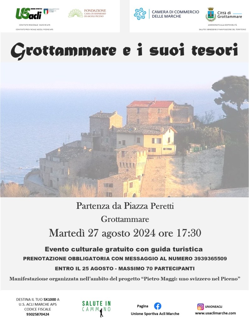 Martedì 27 agosto, a Grottammare, si svolgerà ‘Grottammare e i suoi tesori”, manifestazione che rientra nel progetto “Pietro Maggi: uno svizzero nel Piceno” a cura di Unione Sportiva Acli Marche Aps. L’evento è realizzato col sostegno della Fondazione Cassa di Risparmio di Ascoli Piceno, della Camera di Commercio delle Marche e del Comune di Grottammare, assessorato alla sostenibilità, salute, benessere e pianificazione del territorio.
