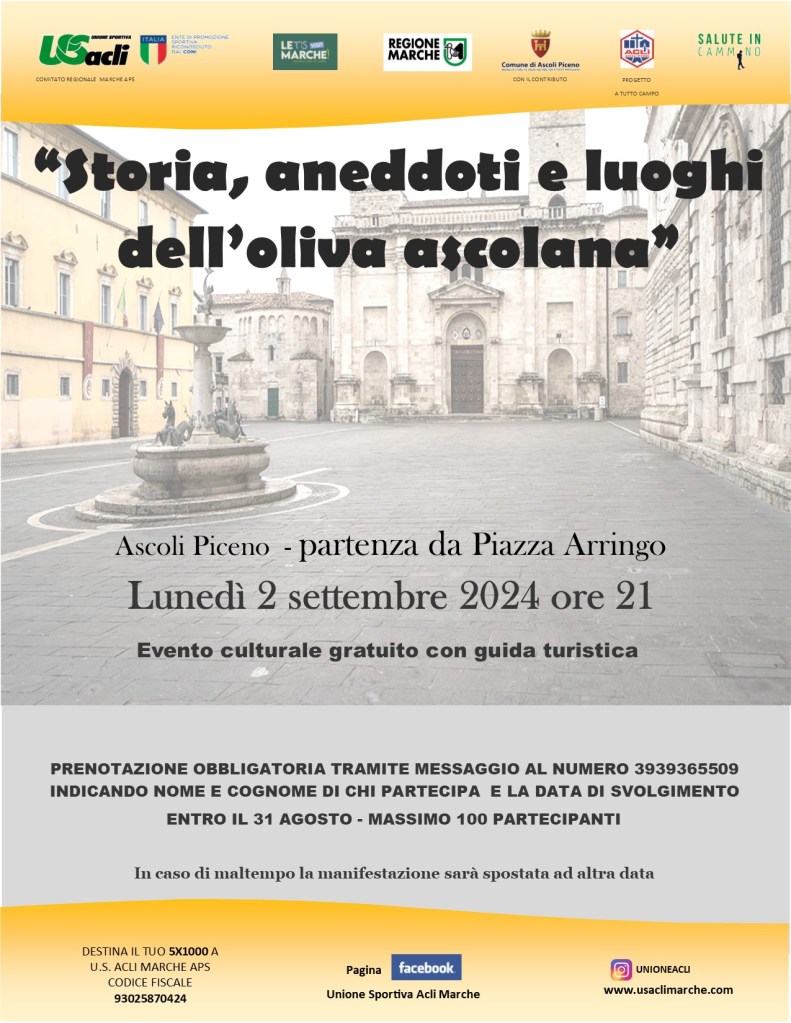 Lunedì 2 settembre è previsto un percorso cittadino dedicato alla storia, agli aneddoti ed ai luoghi dell’oliva ascolana, percorso che non era stato possibile attraversare il 19 agosto causa pioggia.