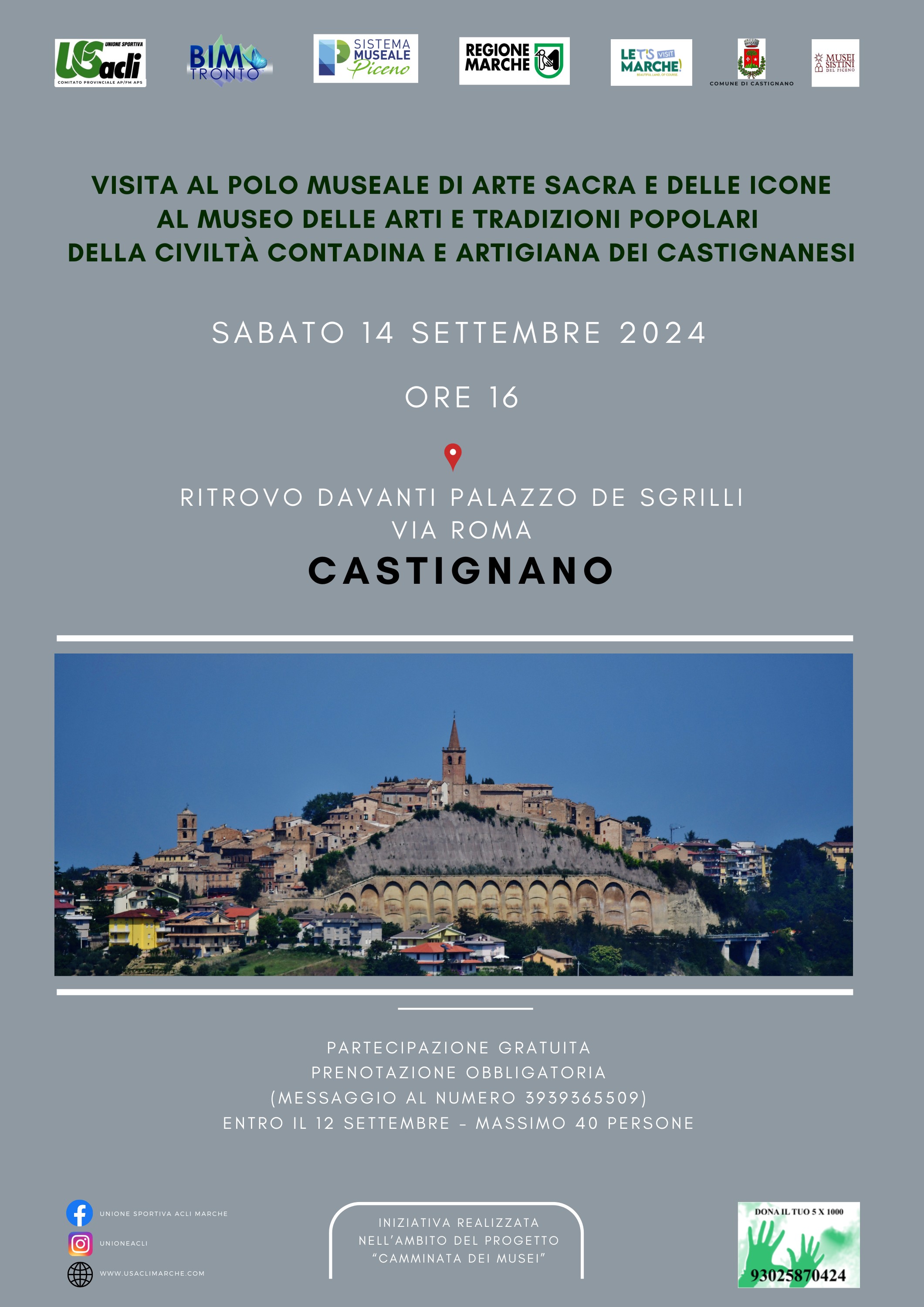 Sabato 14 settembre alle ore 16 si svolgerà, grazie alla collaborazione tra Bim Tronto e U.S. Acli provinciale Aps, un nuovo appuntamento dell’iniziativa “Camminata dei musei” che farà tappa a Castignano.