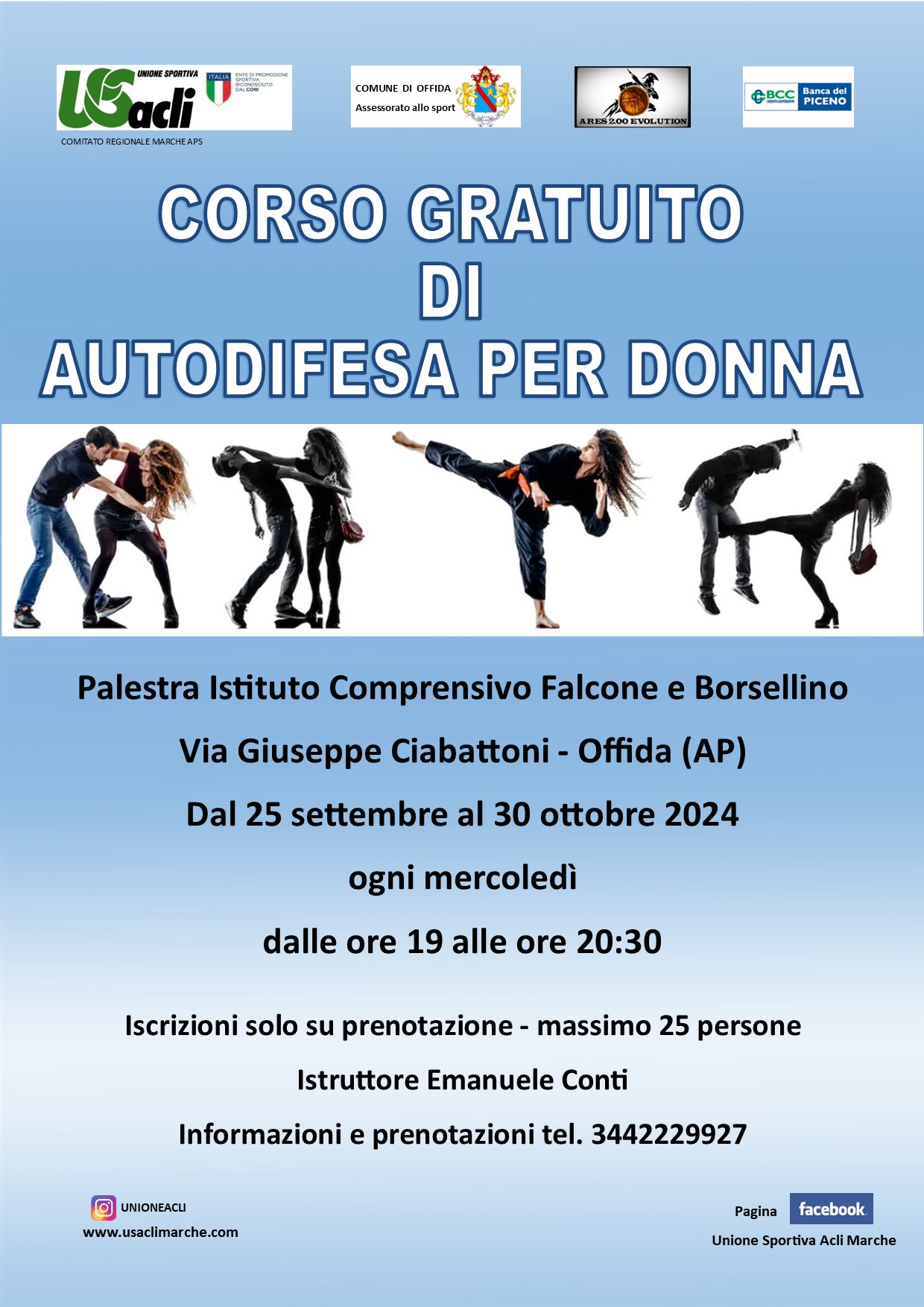 Sono aperte le iscrizioni al corso gratuito di autodifesa per donne che si svolgerà presso la palestra dell’Istituto Comprensivo Falcone e Borsellino in via Giuseppe Ciabattoni a Offida.