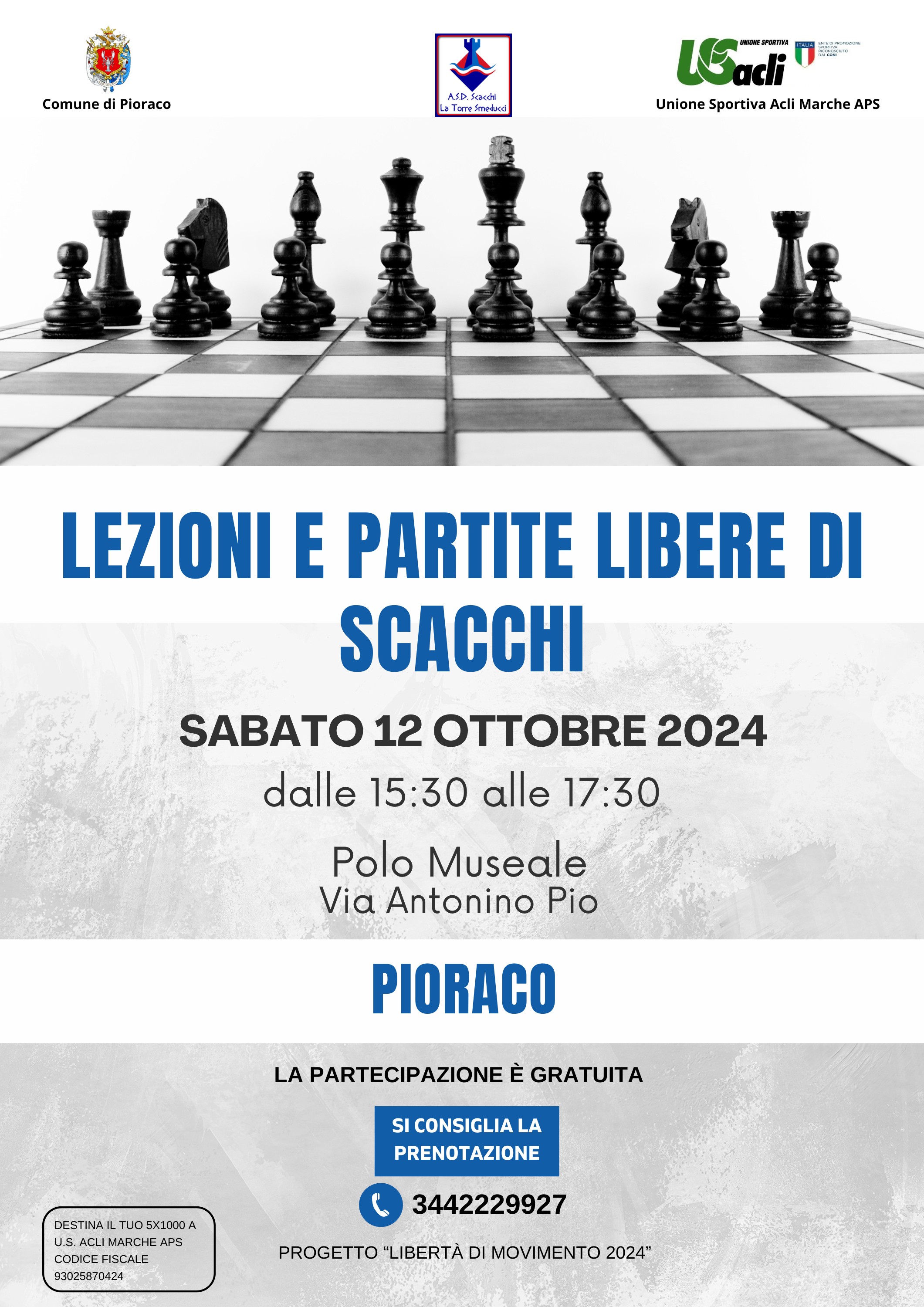 Sabato 12 ottobre, presso il Polo museale di via Antonino Pio di Pioraco, sono in programma, dalle 15,30 alle 17,30, lezioni e partite libere di scacchi.