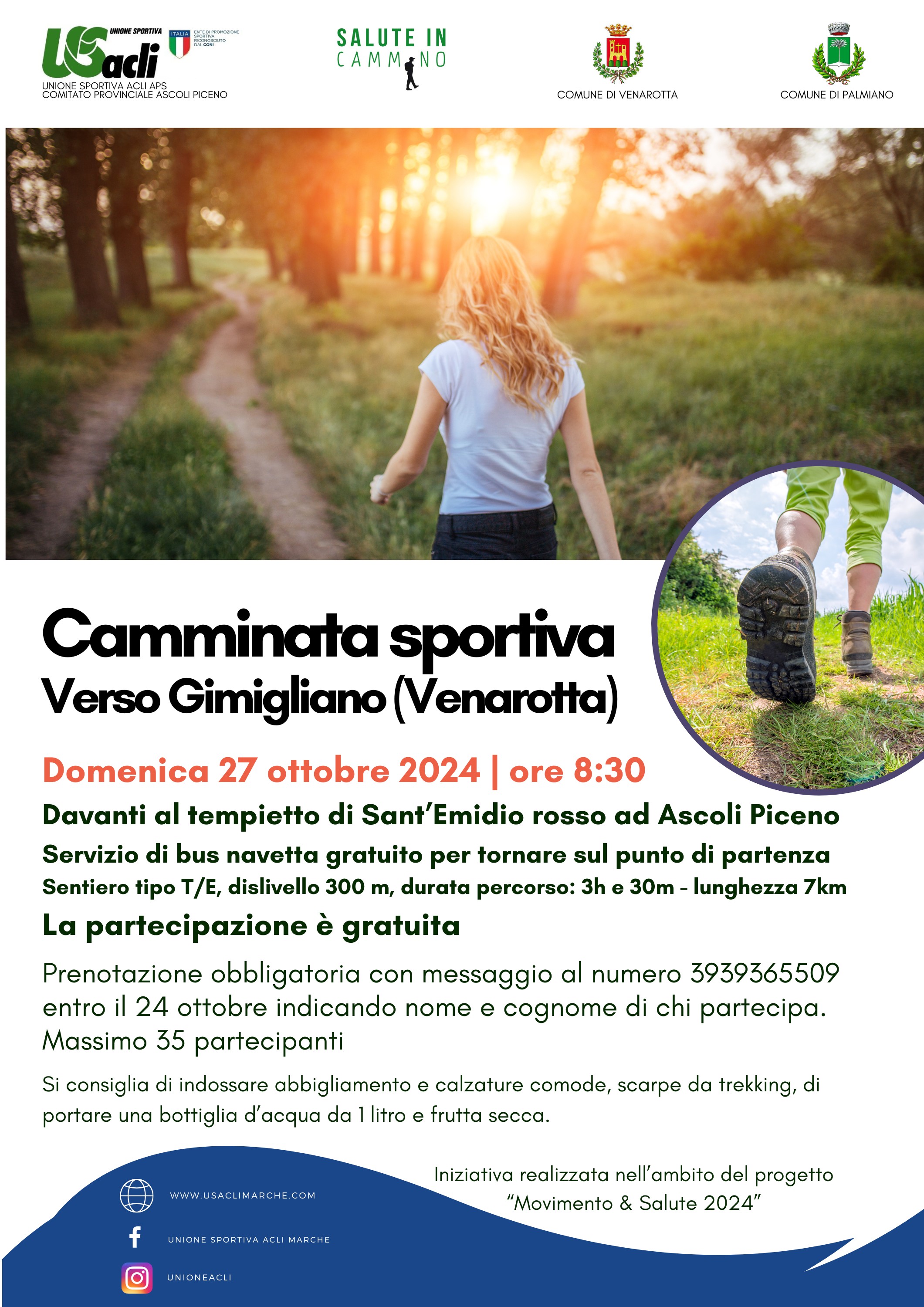 Domenica 27 ottobre si svolgerà una camminata sportiva con partenza alle 8,30 davanti al tempietto di Sant’Emidio Rosso ad Ascoli Piceno e con destinazione Gimigliano di Venarotta.