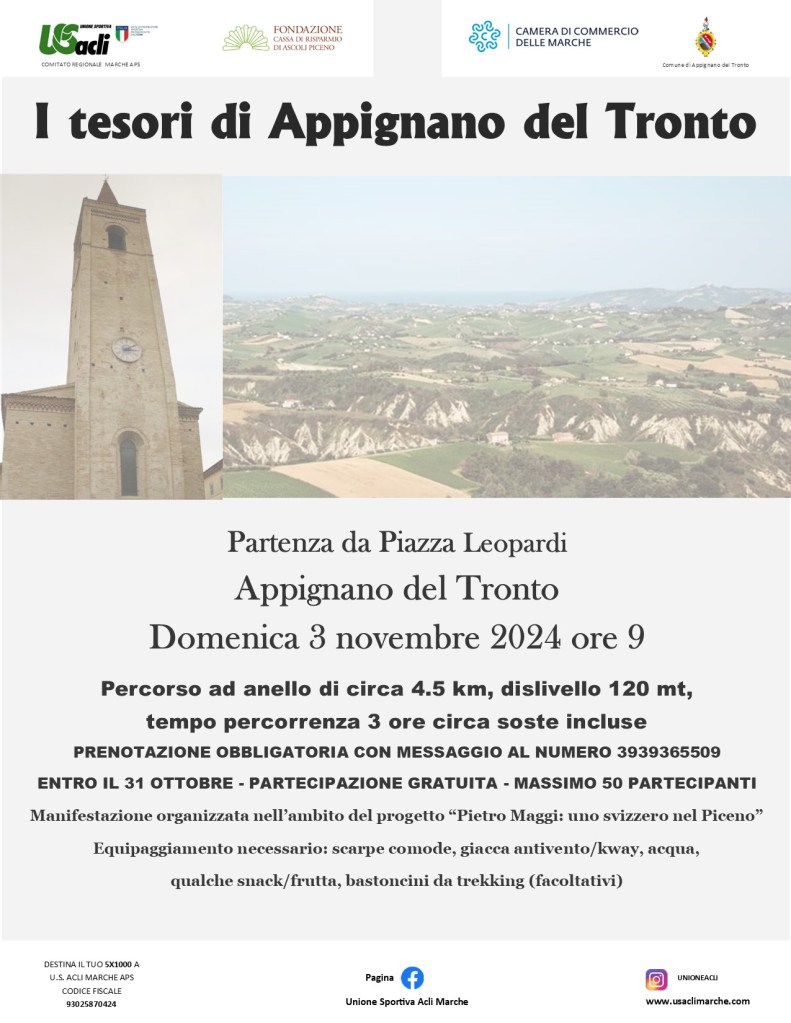 Domenica 3 Novembre, a Appignano del Tronto, si svolgerà ‘I tesori di Appignano del Tronto”, manifestazione che rientra nel progetto “Pietro Maggi: uno svizzero nel Piceno” a cura di Unione Sportiva Acli Marche Aps.