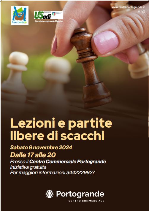 SAN BENEDETTO DEL TRONTO – Sabato 9 novembre, dalle 17 alle 20, si svolgeranno lezioni e partite libere di scacchi aperte a persone di ogni età, presso il Centro commerciale PortoGrande (Via Pasubio 144).