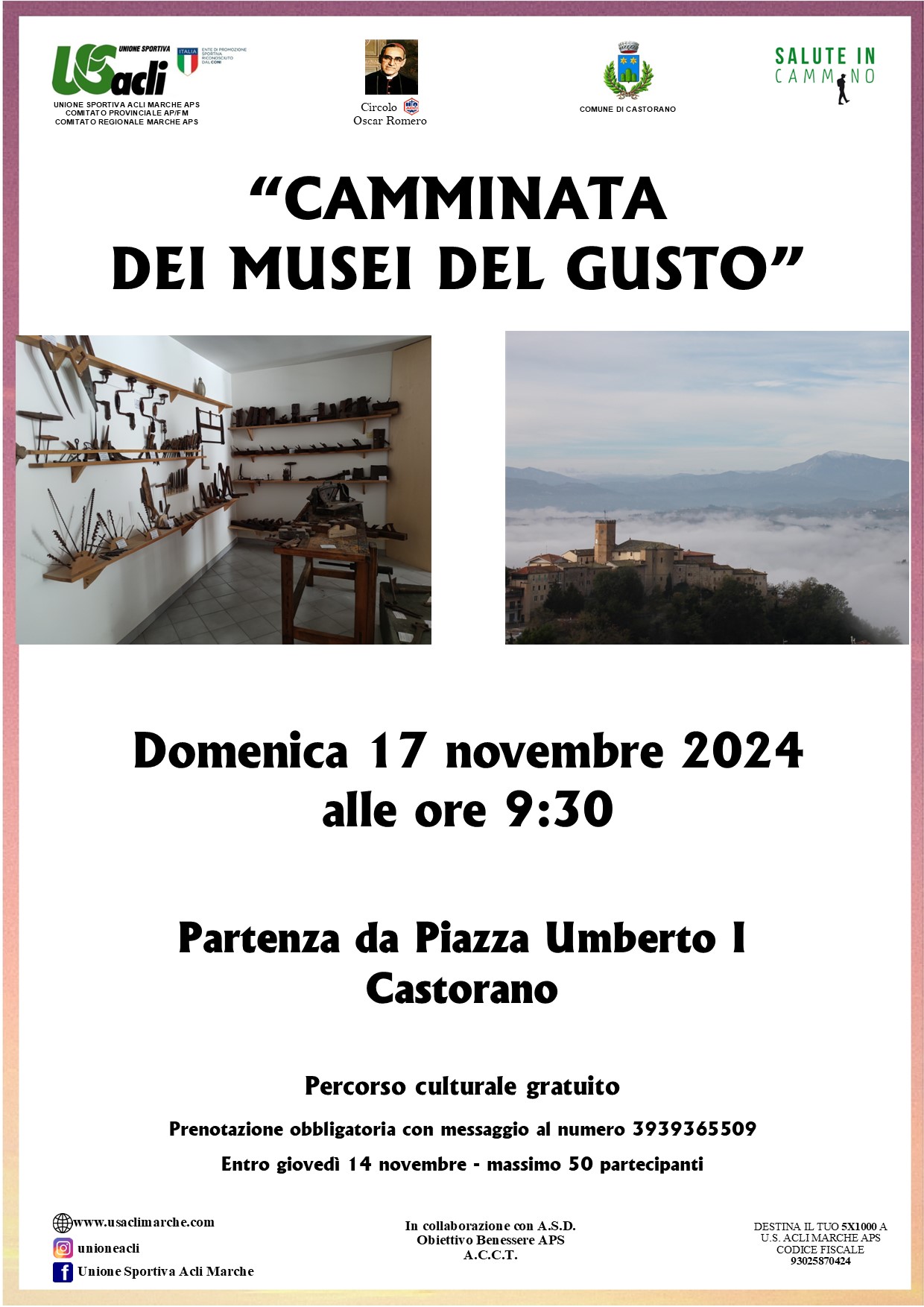 L’appuntamento è alle 9,30 in Piazza Umberto I, nei pressi della torre civica, quando si svolgerà l’iniziativa “Camminata dei musei del gusto”, promossa da U.S. Acli provinciale Aps col sostegno della Regione Marche.