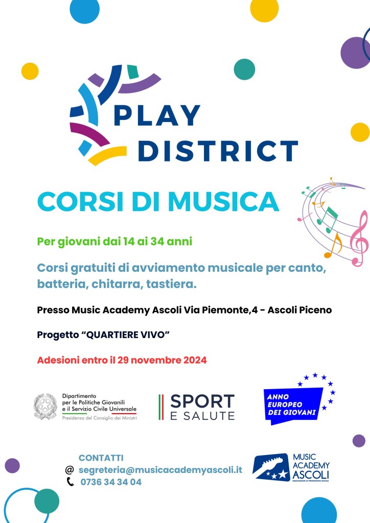 E’ ancora possibile iscriversi ai corsi gratuiti di avviamento musicale per canto, batteria, chitarra e tastiera, riservati a giovani dai 14 ai 34 anni, che si svolgeranno presso Music Academy Ascoli in via Piemonte 4 ad Ascoli Piceno.