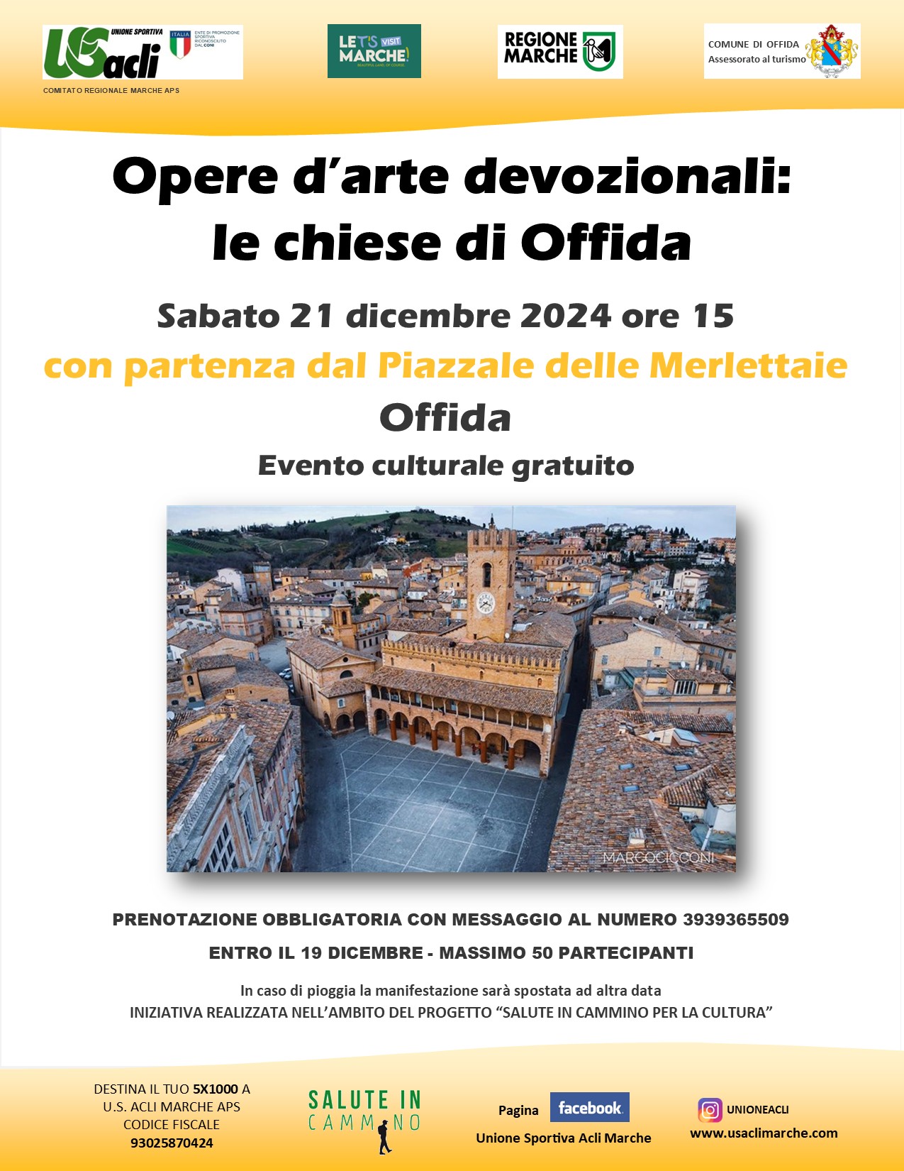 Nuovo appuntamento, sabato 21 dicembre, con l’iniziativa “Salute in cammino per la cultura”, promossa per il settimo anno consecutivo dall’Unione Sportiva Acli Marche Aps.