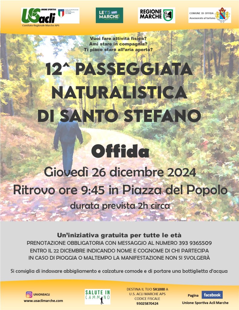 OFFIDA – Il 26 dicembre è in programma la dodicesima edizione della Passeggiata naturalistica di Santo Stefano. La manifestazione, divenuta ormai un classico per il giorno dopo Natale, prenderà il via alle ore 9,45 in Piazza del Popolo, prevede l’attraversamento di un percorso naturalistico della durata di circa 2 ore al termine del quale si tornerà sul punto di partenza. La partecipazione all’iniziativa, organizzata in collaborazione con U.S. Acli Marche APS e col sostegno di Regione Marche e assessorato al turismo del Comune di Offida, è gratuita ma occorre preiscriversi con un messaggio al numero 3939365509, indicando la data della manifestazione e nome e cognome di chi partecipa. Si consigliano abbigliamento e calzature comode e di portare una bottiglietta d’acqua.