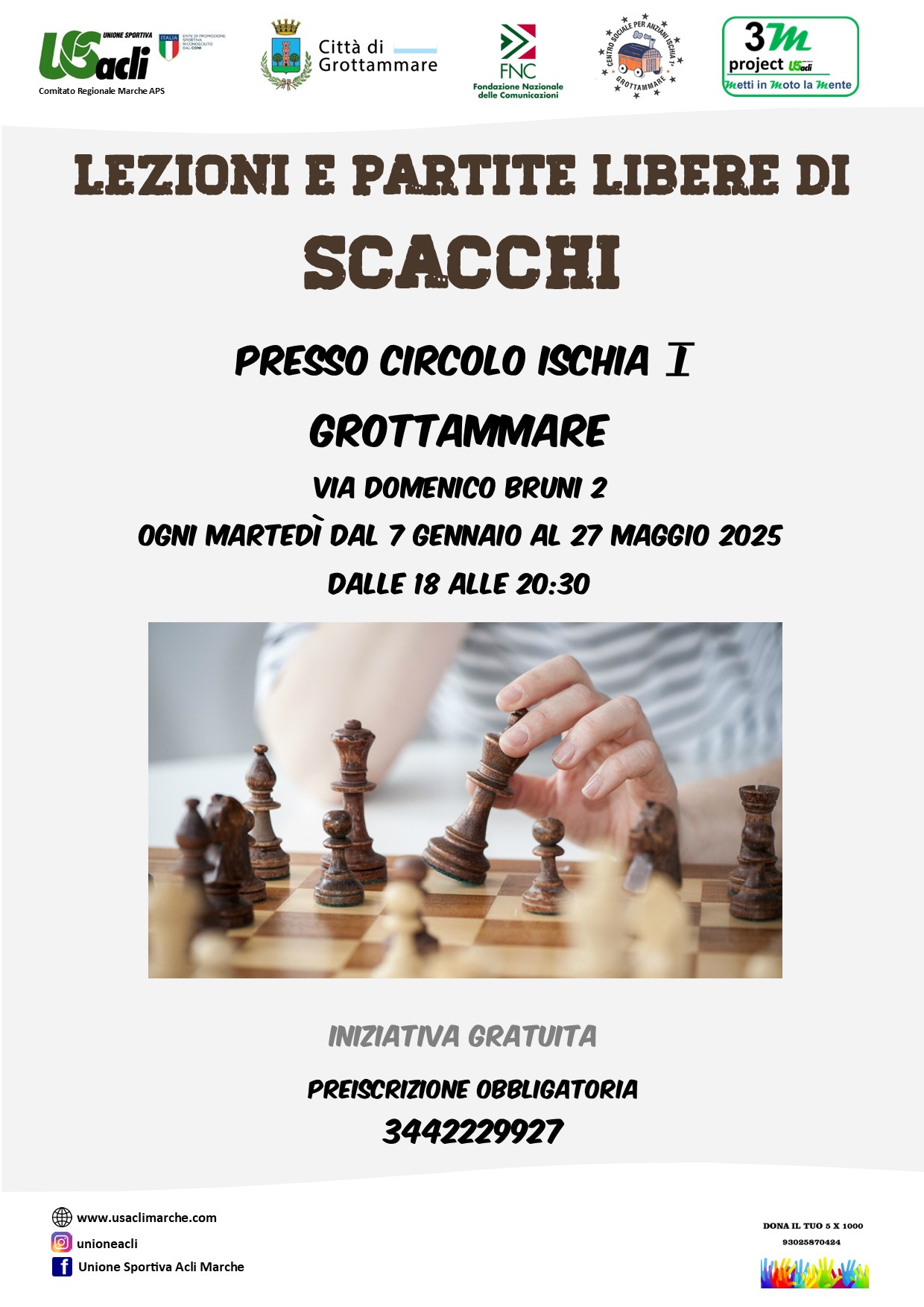 GROTTAMMARE – Anche nel 2025 si svolgeranno ogni martedì, dalle 18 alle 20,30, le lezioni e partite libere di scacchi aperte a cittadini di ogni età, presso i locali del Centro sociale Ischia I, in Via Domenico Bruni 2.
